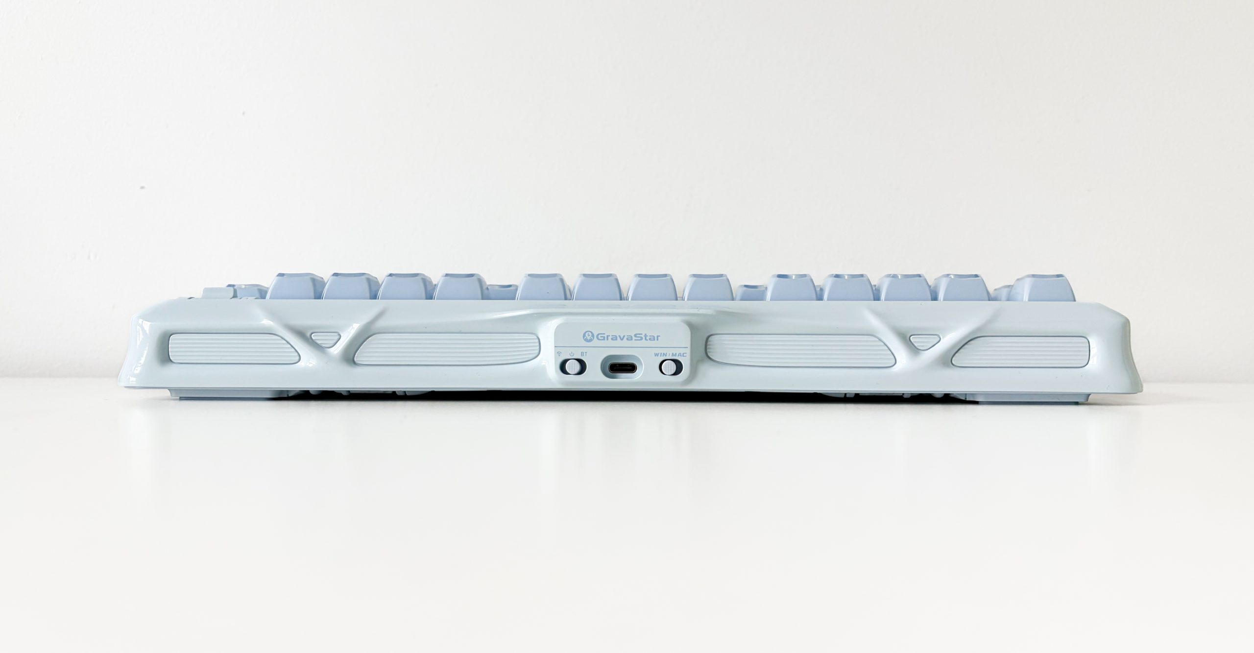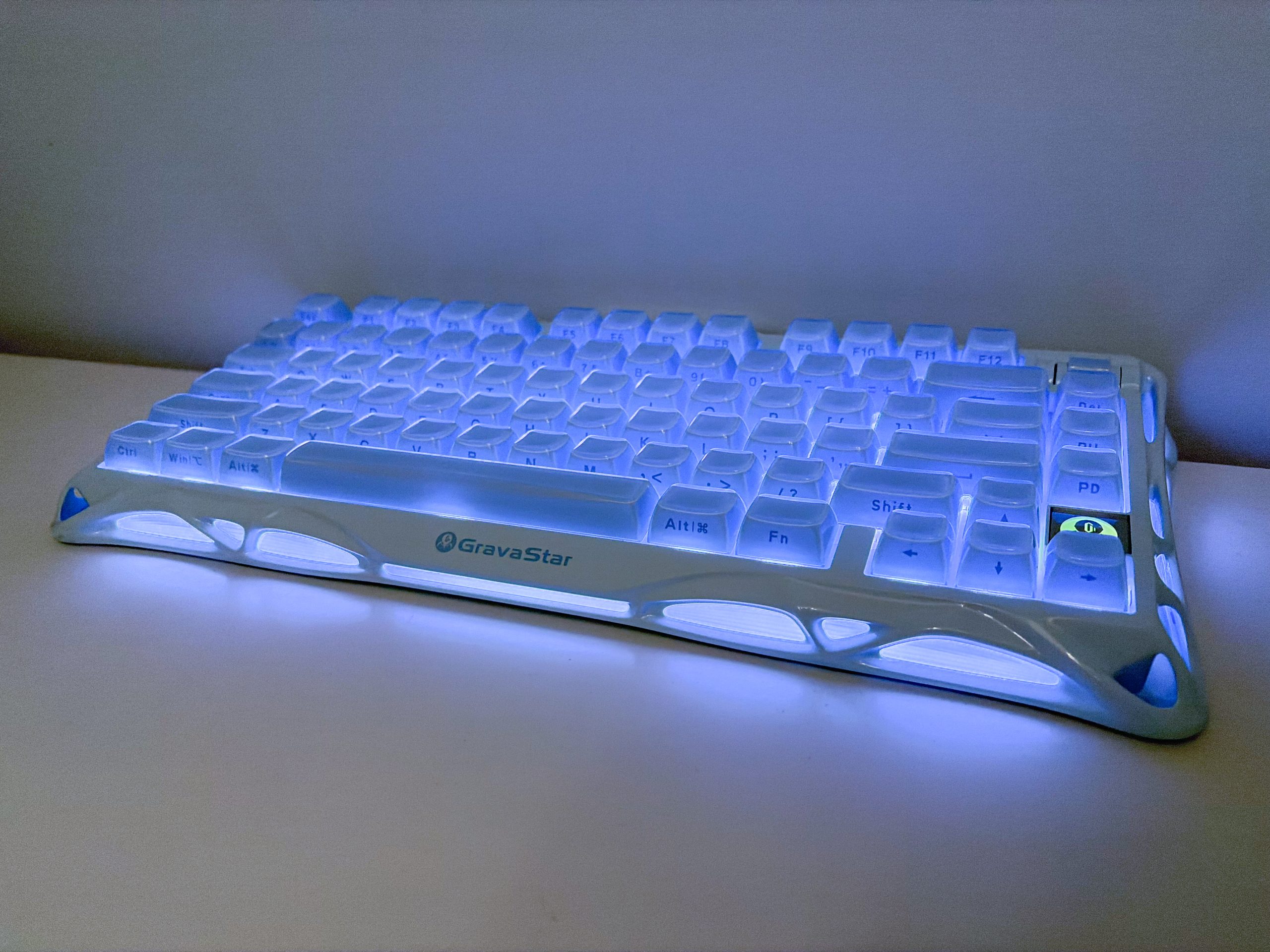Osobiście jako odwieczny wróg świecidełek na biurku jestem w stanie zaakceptować podświetlenie jeśli to wprowadza jakiś pozytyw do klawiatury, jak na przykład w TX EO87 gdzie połowa obudowy jest przezroczysta. Tutaj mamy podobny case, to znaczy GravaStar mógłby zaprojektować korpus w zupełnie inny sposób, ale bez tych mlecznych wstawek proszących się o puszczenie przez nie światła w kolorze odpowiadającym reszcie (tutaj błękitnym) nie byłoby to już to samo. Mam natomiast problem z innym elementem, choć także powiązanym z LED-ami. Chodzi o emblemat tuż nad prawą strzałką, który producent z jakiegoś powodu wykonał w taki sposób żeby kompletnie nie pasował on do całej estetyki przedmiotu recenzji. Nie dość, że wykończenie jest srebrne, wpadające w lustro, to jeszcze logotyp jest podświetlany na kolorowo i nie ma sposobu na zmianę w jednolitą barwę. Ten jeden aspekt może i nie rujnuje całej estetyki K1, ale jest niewątpliwie jej bardzo słabym ogniwem. Podobnie rzecz ma się z brandingiem, a konkretnie ogromnym logotypem GravaStar na froncie obudowy. Ten co prawda ma jasnoniebieski kolor i nie kontrastuje jakoś przesadnie z tłem, ale moim zdaniem klawiatura ta i tak wyróżnia się na tyle, że nie ma potrzeby pakowania na niej logo czy nazwy marki żeby przypominać każdemu kto jest autorem – serio, produkt się wybroni i każdy zapamięta kto go produkuje nawet bez logotypów.