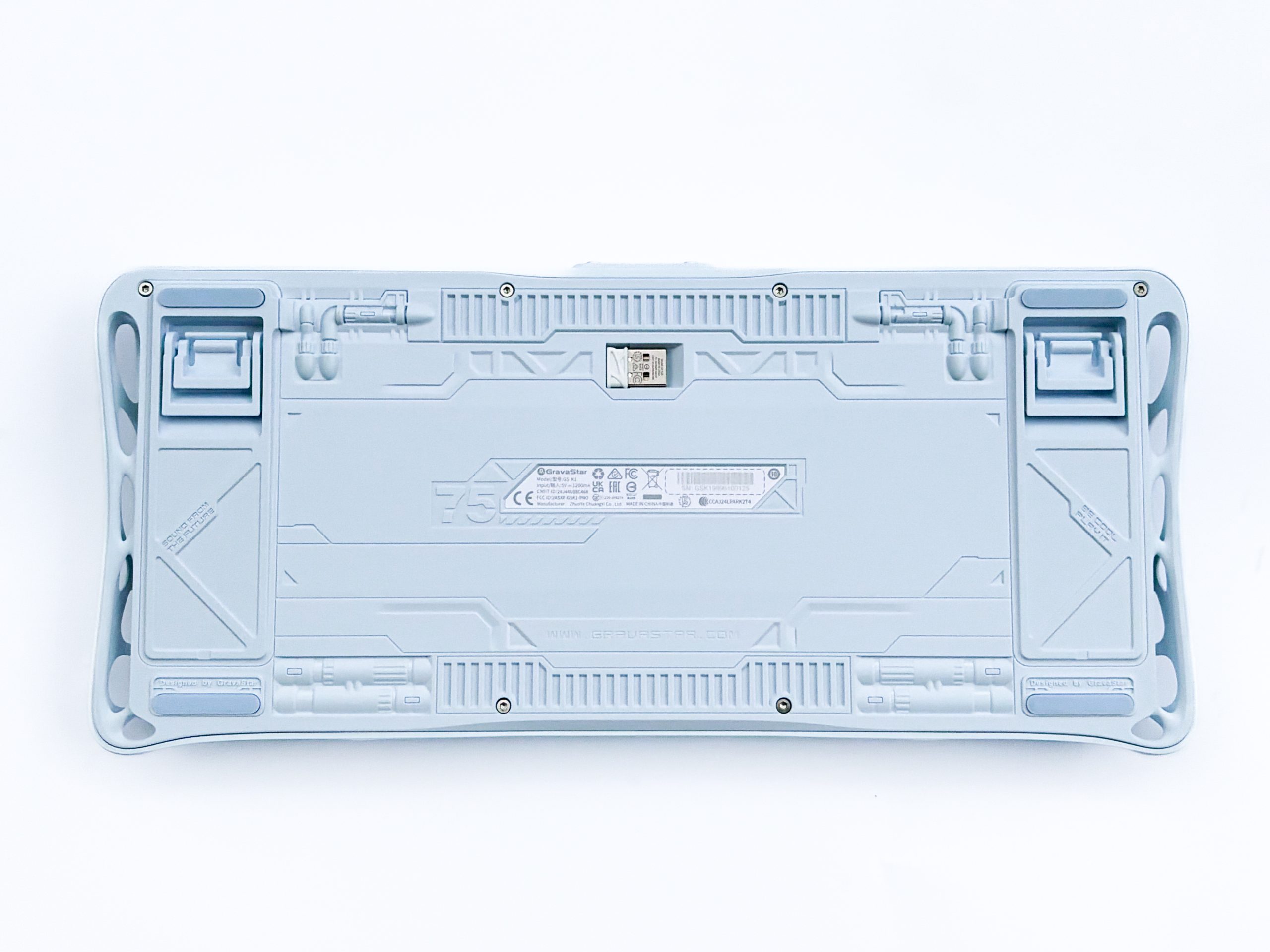 Na tyle osadzone zostały dwa przełączniki trybu z wyśrodkowanym złączem USB-C pomiędzy nimi. Ów suwaki chodzą bardzo przyjemnie, z wyraźnymi przeskokami, a ich rolą jest zmiana układu z Windowsowego na Mac oraz przełączanie między trybem przewodowym, BT i 2,4 GHz. Spód obudowy to z kolei kontrast dla góry, bardziej przypominający statek kosmiczny zamiast biologicznego eksperymentu, gdyż tam GravaStar zagospodarował całą przestrzeń kształtami i wzorami ewidentnie mającymi imitować jakieś elementy nieznanej ludzkości technologii. Przystępnie zostały tam także poukrywane różne napisy, takie jak chociażby wielkie „75” przypominające nam o formacie testowanej dziś klawiatury, a także „Designed by GravaStar” wkomponowane tak dobrze, że na pierwszy rzut oka wręcz niewidoczne. Znajdziemy tam rzecz jasna też rozkładane nóżki do regulacji kąta nachylenia (szkoda, że takie normalne – wymyślny design zarezerwowany jest dla modelu Pro) oraz gumki antypoślizgowe, a dla mnie ważne jest też to, że są one w tym samym kolorze co reszta korpusu. Na środku jest też naklejka z numerem seryjnym oraz otwór na przechowywanie adaptera 2,4 GHz, w dodatku magnetyczny.
