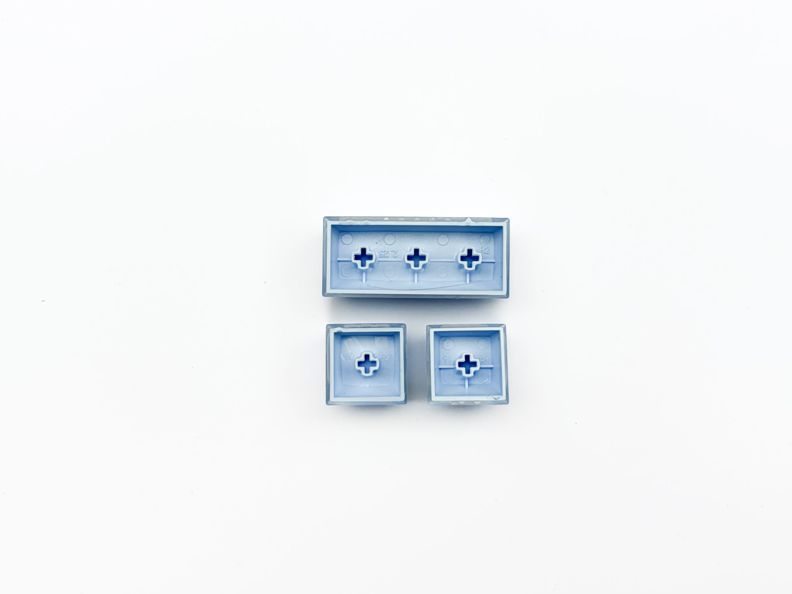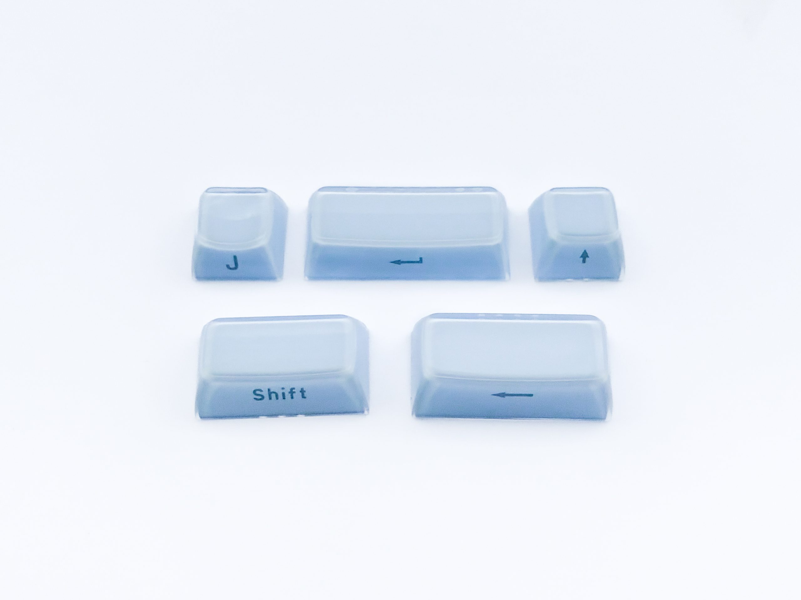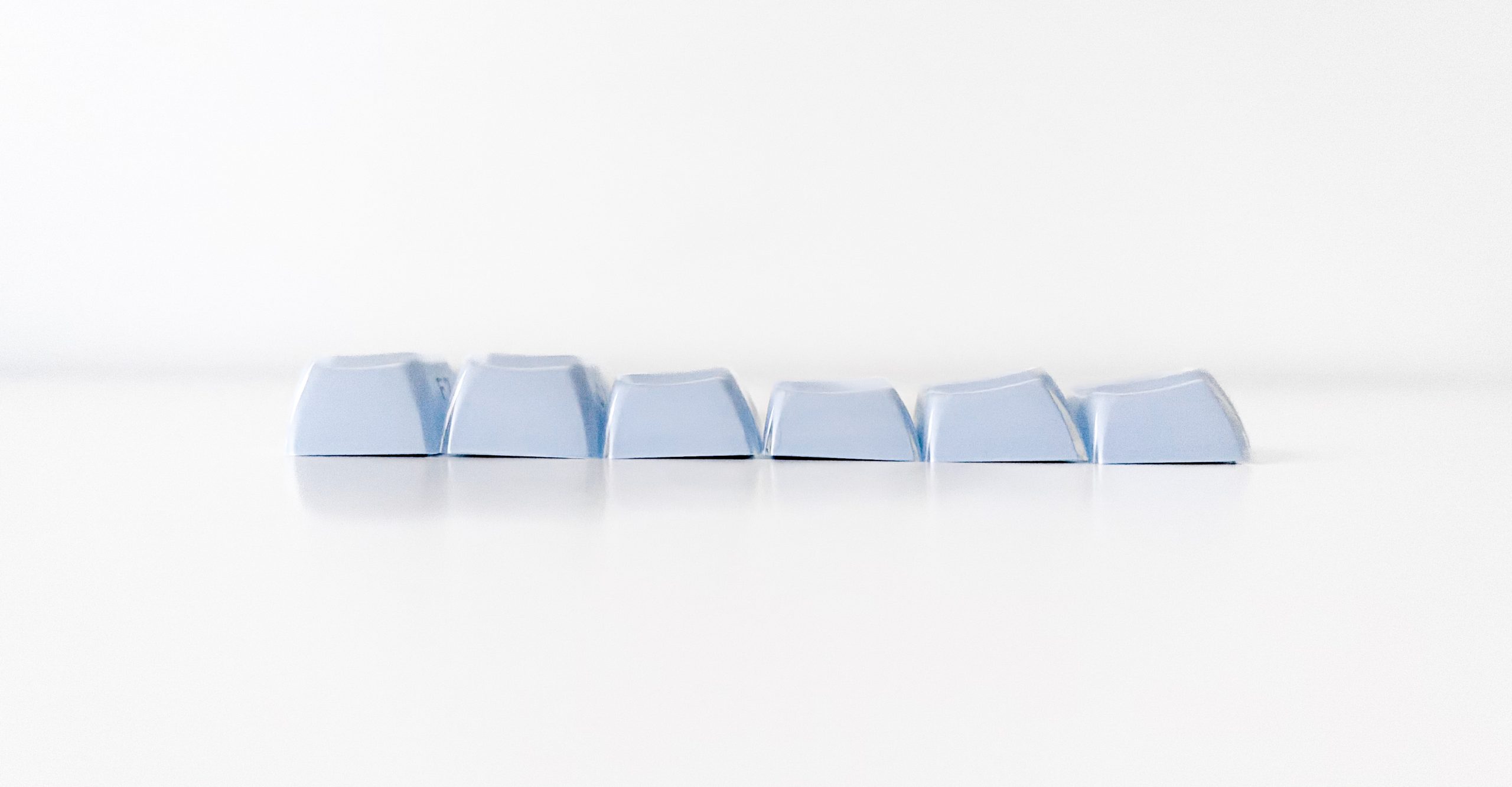 Doskonałym dopełnieniem dla i tak świetnie zaprojektowanej klawiatury jaką jest GravaStar Mercury K1 są zamontowane na niej nakładki. Obyłoby się moim zdaniem bez wymyślania czegokolwiek stricte wpasowującego się w stylistykę kosmosu i obcych ras, na przykład standardowe nieprześwitujące Cherry, ale zamiast tego producent postawił na dwuczęściowe keycapy imitujące na swój sposób kostki lodu (a przynajmniej mam nadzieję, że taki był zamysł). Można więc rzec, że mamy tu do czynienia z double-shot’em, ale w praktyce nie przekłada się to na te same korzyści co w konwencjonalnych nakładkach. Tutaj bowiem wewnętrza warstwa jest wykonana z jednolitego, jasnoniebieskiego ABS-u, zaś ta zewnętrza to przezroczysty poliwęglan. Nadruki skrywają się z kolei na froncie każdego z keycapów, tworząc tak zwany styl ninja. Co do zasady nie ma znaczenia jak naniesiono literki, bowiem te i tak nie mają kontaktu z naszymi palcami i tak czy inaczej nigdy nie zejdą, choć tu w dodatku chroni je ta przezroczysta warstwa – to znaczy tak to wygląda pod każdym kątem i szczerze wątpię żeby był to laserowy grawer w zewnętrznym poliwęglanie bez wyczuwalnej różnicy w fakturze. Podoba mi się podejście marki GravaStar do stylu, bo nie oszczędza nawet na takiej płaszczyźnie, choć spokojnie by mogła. Dzięki temu dostajemy bardzo fajny efekt i zgraną całość.