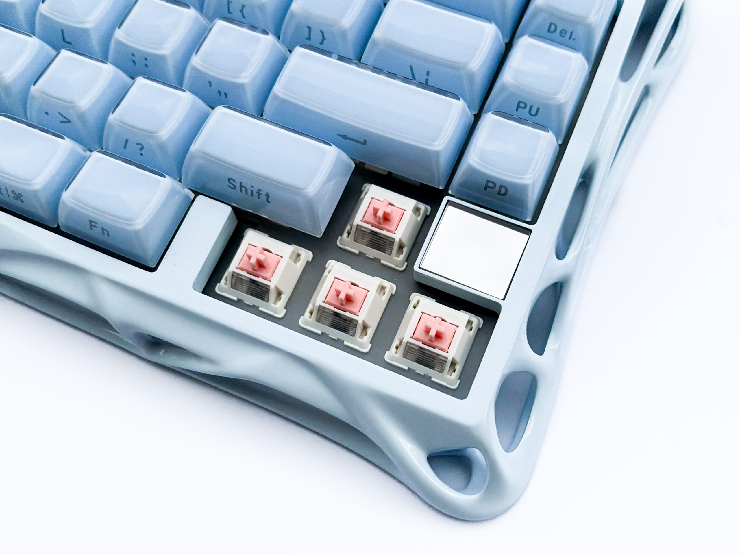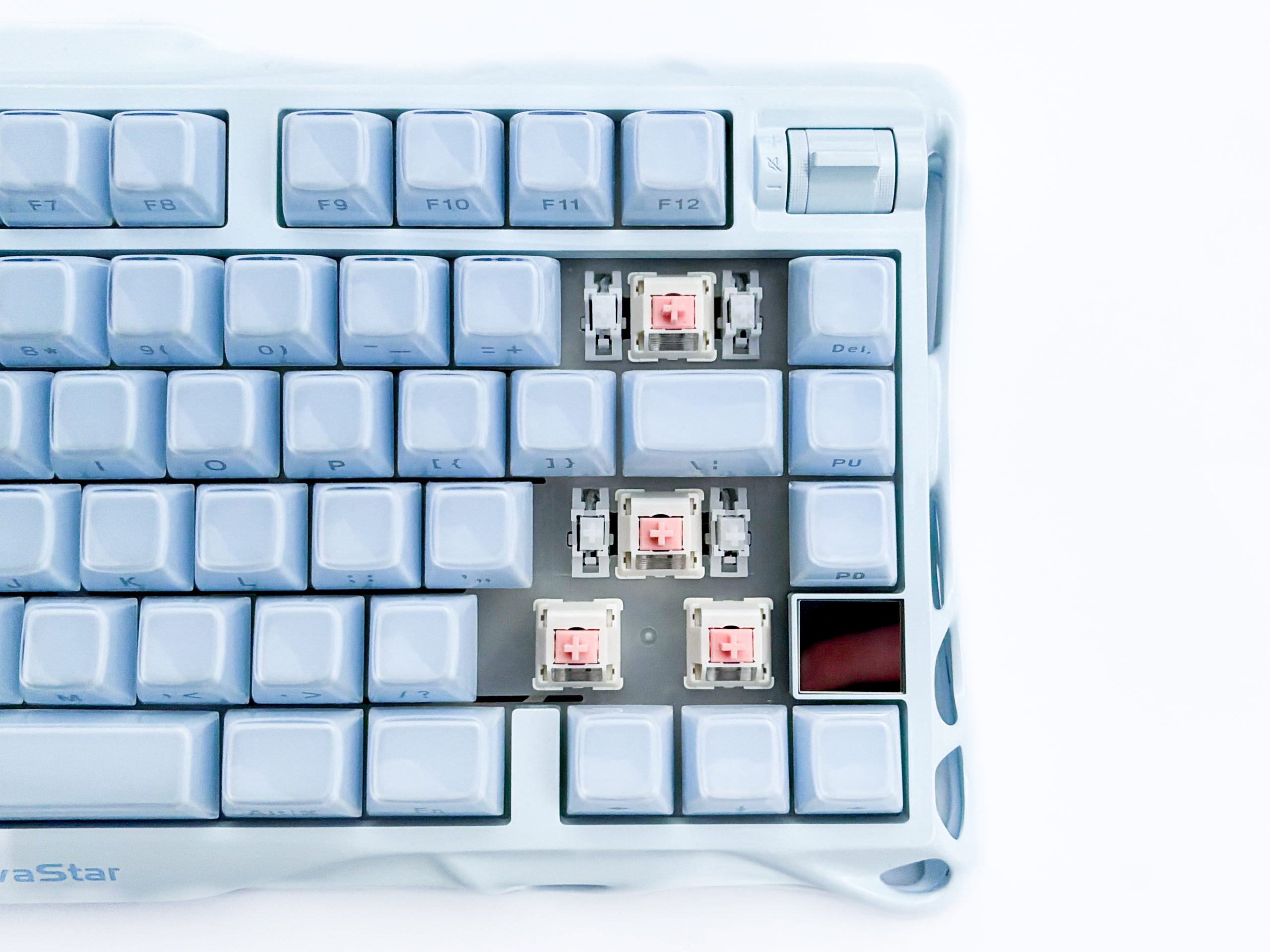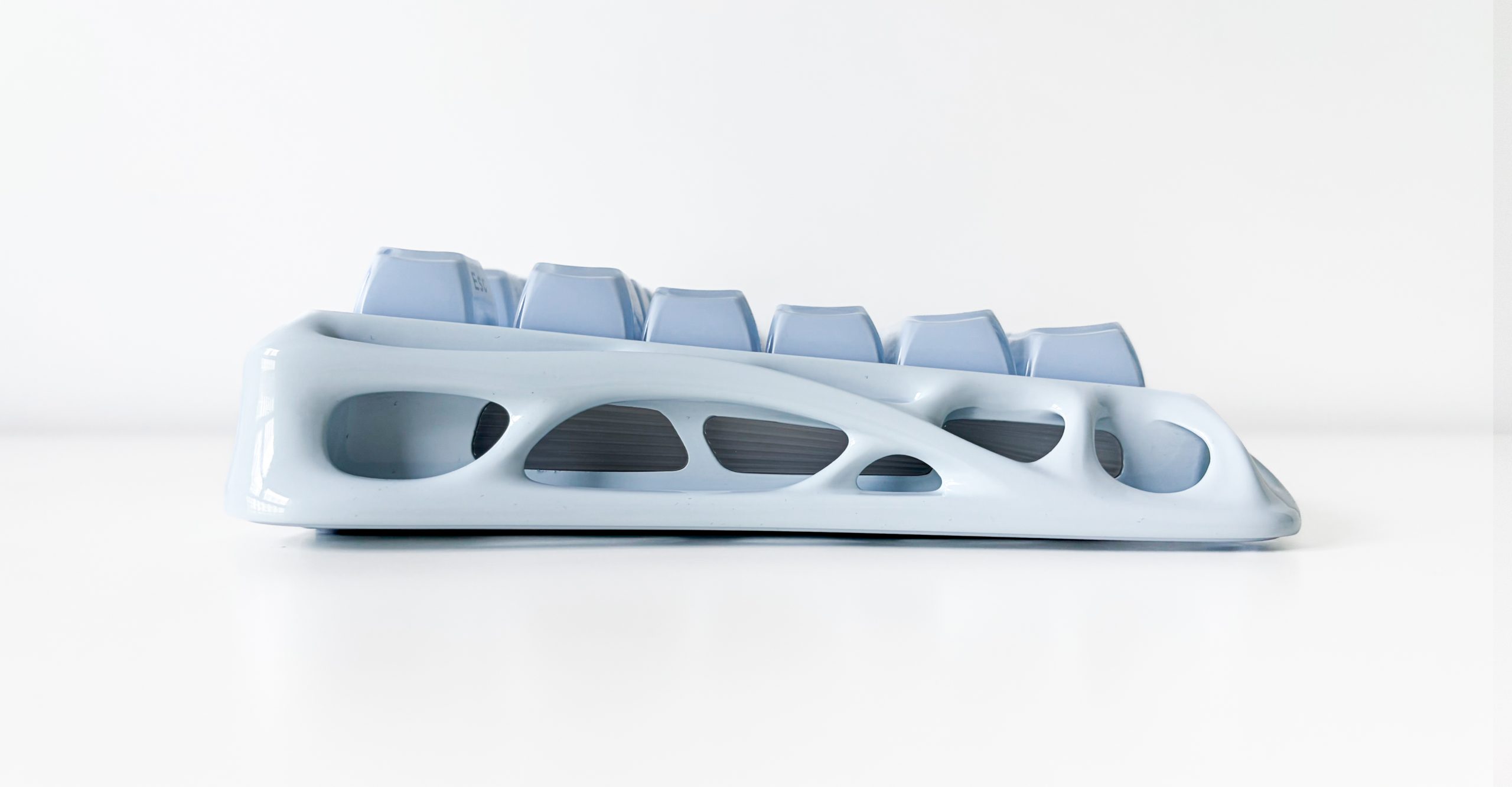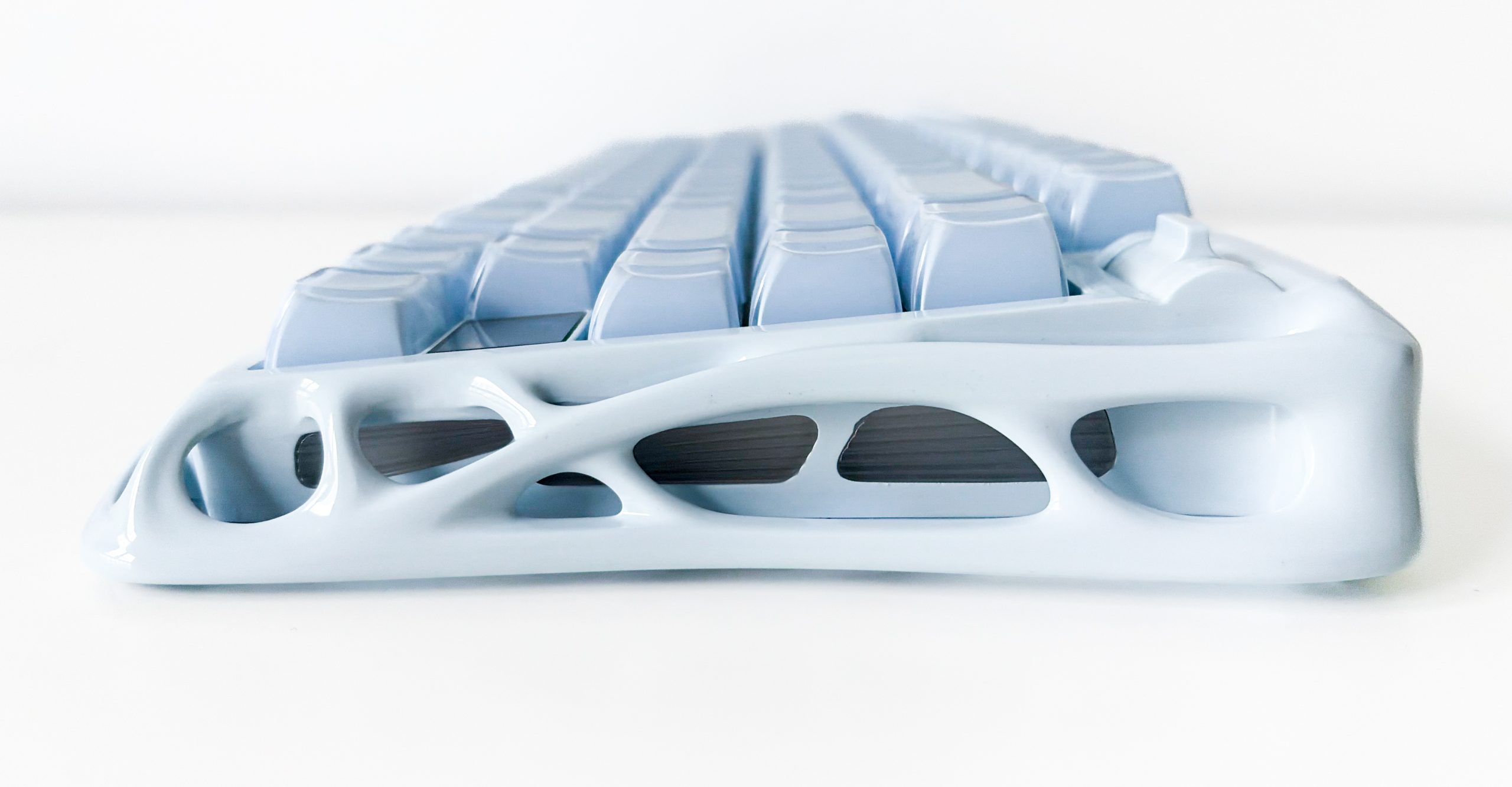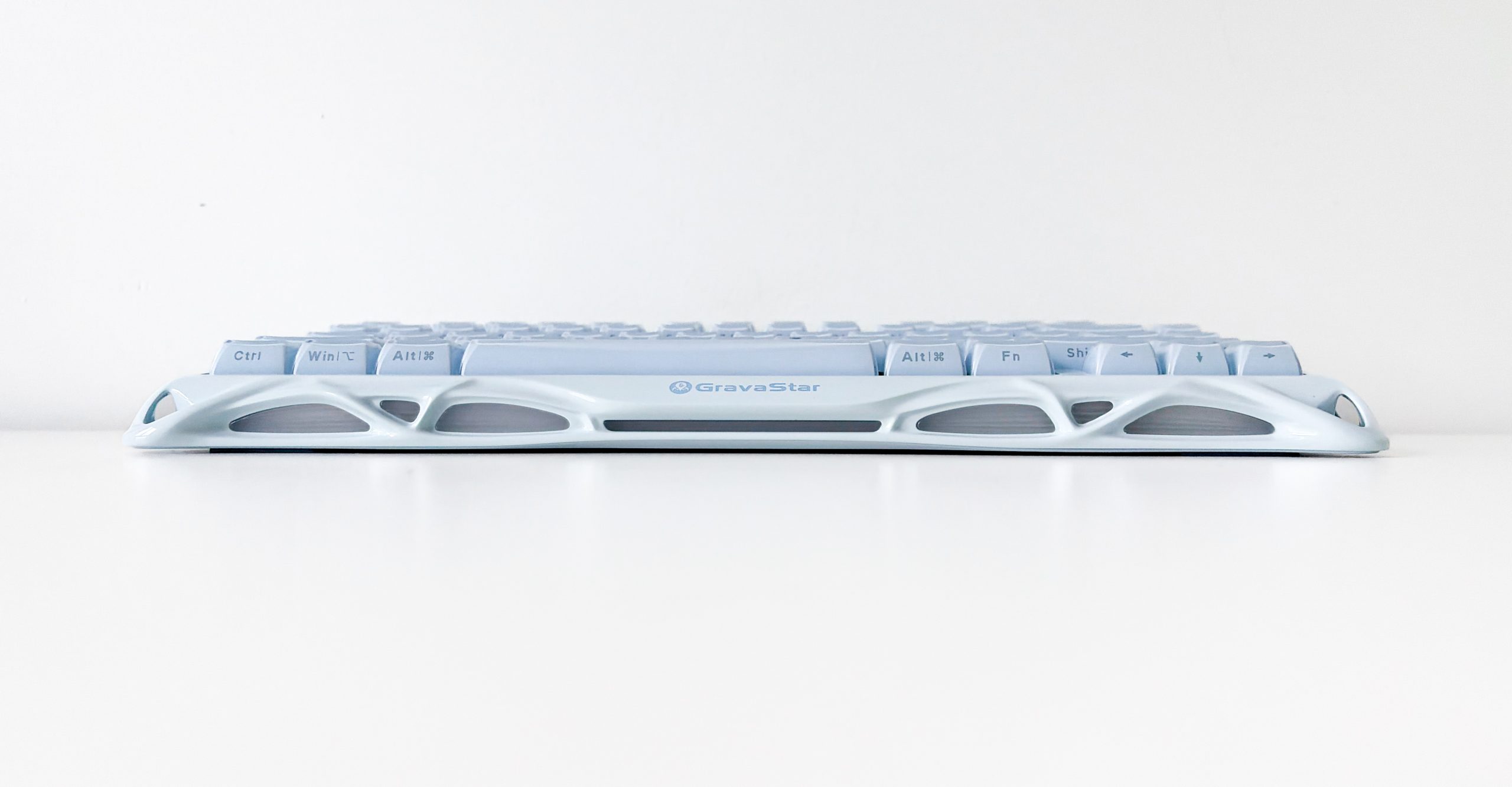 No właśnie, kolor. Mercury K1 występuje w czterech wersjach, gdzie dwie podstawowe to czarna i biała, a ta trzecia i dzierżona przeze mnie na rzecz dzisiejszego testu – jasnoniebieska, ewidentnie mająca w jakiś sposób nawiązywać do zimy i lodu, na co wskazuje też nazwa Ice Blue. Jest też wariant różowy, co jest fajnym dopełnieniem kolekcji, bowiem dzięki temu każdy znajdzie coś dla siebie. Calutka obudowa nosi tę samą barwę, zarówno jej górna jak i dolna część, a także keycapy odpowiadają swoim odcieniem reszcie, co często nie jest tak oczywiste i zdarza się, że producent przez słabą kontrolę jakości dopuszcza nakładki znacząco odstające od reszty. Tutaj nie ma na to miejsca i bardzo mnie to cieszy, choć oczywiście przez zastosowanie różnych materiałów nie jest to też perfekcja i w odpowiednim świetle zobaczymy, że nakładki mają delikatnie inny odcień. Gdy wyłączymy zaś podświetlenie, od razu dostrzeżemy trzecią część obudowy, którą stanowi prześwitujący, mleczny plastik widoczny z każdej strony i ukryty wręcz w środku tych wszechobecnych otworów. Nie wygląda to rzecz jasna najlepiej, dlatego K1 zdaje się być stworzoną do użytkowania wyłącznie z uruchomionym podświetleniem, co dla jednych może być atutem, ale dla innych utrapieniem – nie każdy bowiem kocha choinkowe klawiatury, choć z drugiej strony jeśli ktoś takiej nie chce, to GravaStar Mercury K1 i tak nie jest skierowana do niego.