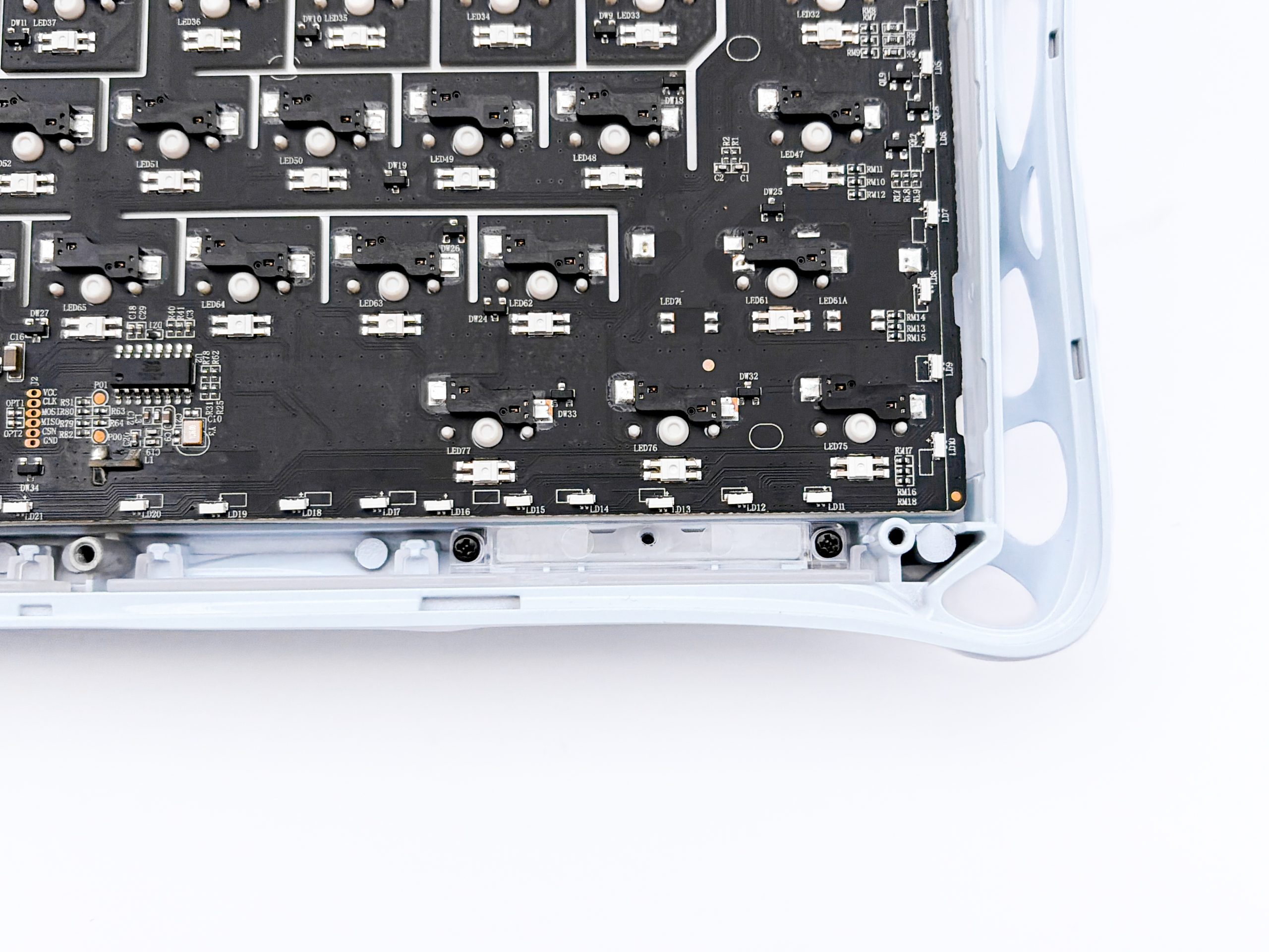 Najciekawszym co tutaj zobaczymy jest natomiast coś innego – sposób montażu. Widzicie, producent zapewnia na stronie, że w Mercury K1 możemy swobodnie wybierać pomiędzy gasket mount’em i top mount’em. To prawda, bo jeżeli usuniemy przezroczyste plasticzki i zsuniemy silikonowe gumki ze skrzydełek odstających od płytki montażowej, a następnie przykręcimy ów płytę bezpośrednio do górnej ramy korpusu w wyznaczonych miejscach, to klawiaturę z montażem uszczelkowym przemieniliśmy w taką opartą o top mount właśnie. Jaka jest z tego korzyść zapytacie? Gasket z reguły stawia na większe uginanie, o ile zastosowane uszczelki są wystarczająco miękkie, podobnie jak płyta montażowa, a w dodatku charakterystycznie separuje brzmienie PCB+plate assembly od reszty klawiatury. Top mount zaś jest nieco sztywniejszy (choć tutaj też dużo większe znaczenie ma sama płytka), a dźwięk jest pełniejszy, bo wibracja i wynikająca z niej fala dźwiękowa swobodnie przedostaje się na powierzchnię obudowy, zamiast krążyć jedynie wewnątrz. Pozwolenie klientom na taki wybór to najlepsze co widziałem w ostatnich latach w klasycznych klawiaturach pre-built, a więc takich gotowych do pracy prosto z pudełka.