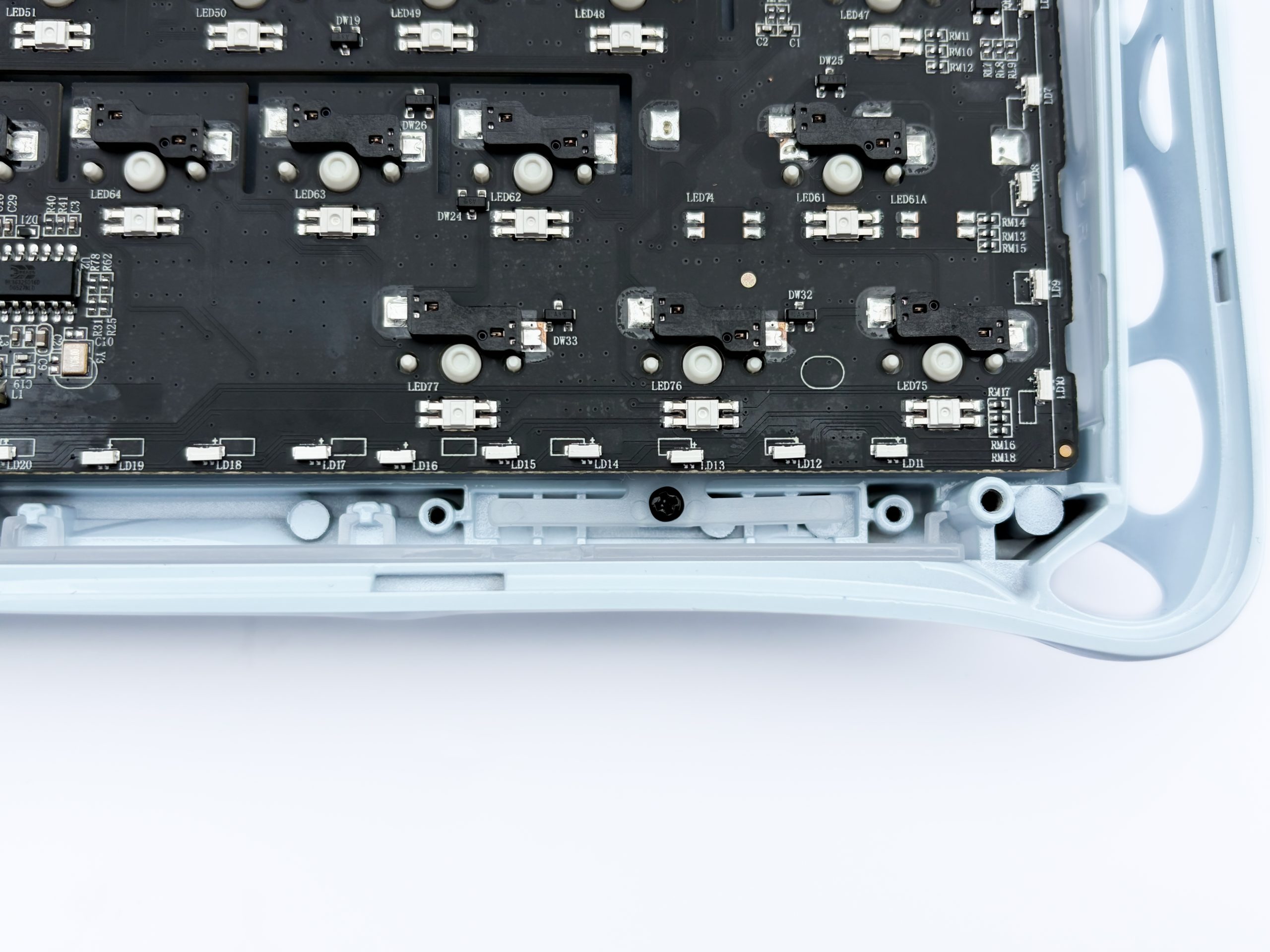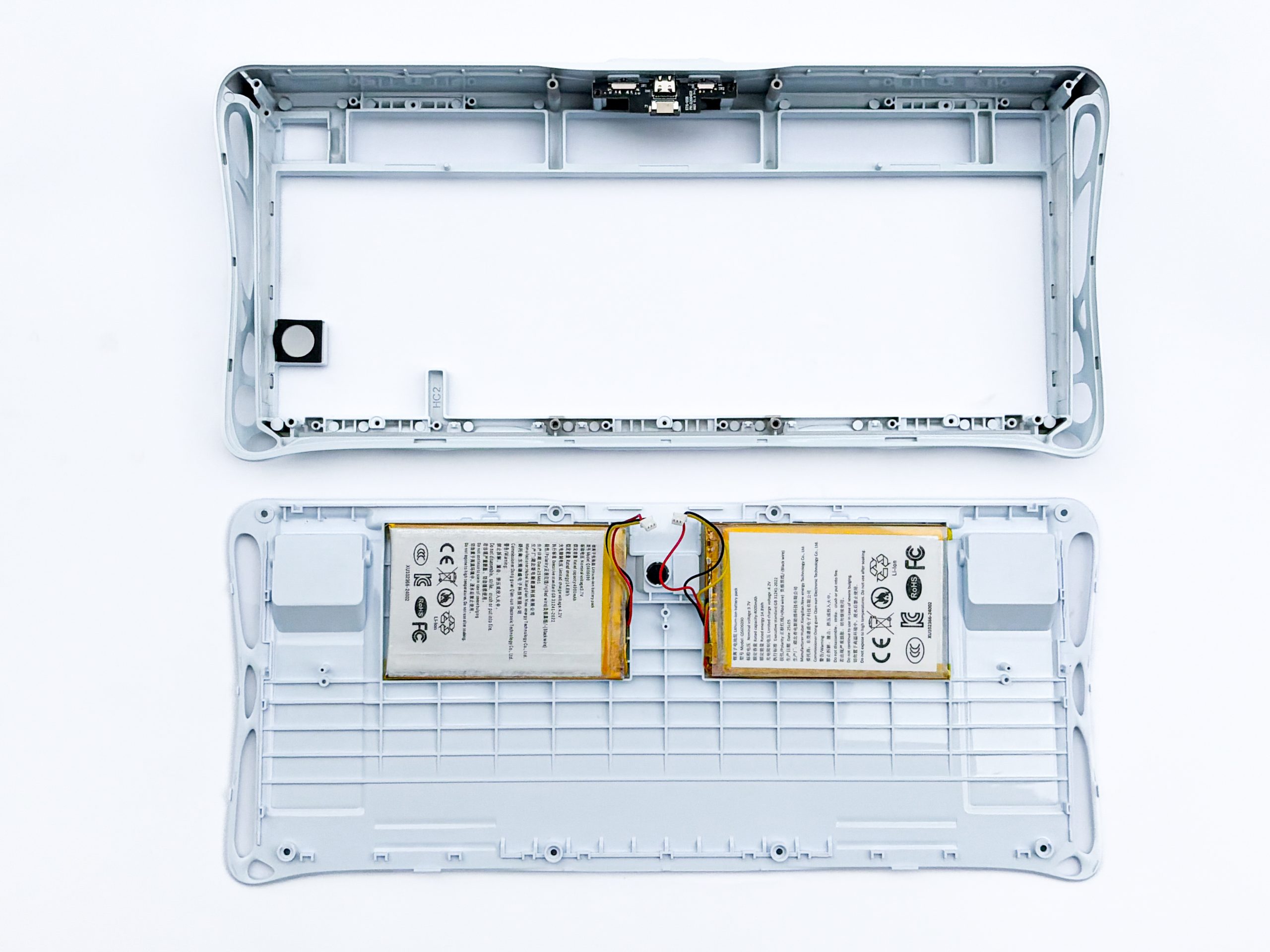 Dostanie się do środka kosmicznego modelu K1 od GravaStar jest nadzwyczaj proste, albowiem wystarczy odkręcić osiem śrubek z główką hex widocznych na spodzie obudowy, z tym że dwie z nich ukryte są pod gumkami antypoślizgowymi. Następnie zsuwamy metalową ramę z plastikowego spodu i po drodze odczepiamy kabelki łączące dwa akumulatory, po 4000 mAh każdy, od płytki drukowanej. Naszym oczom ukaże się wówczas PCB z przyklejoną do jej dołu białą pianką poron o niskiej porowatości oraz czarny silikon, którym producent wyłożył calutką spodnią część korpusu. Kolejnym krokiem jest odkręcenie czarnych śrubek z główkami philips blokującymi uszczelki z zastosowanego tutaj gasket mount’a. Takie rozwiązanie jest dosyć interesujące, bowiem nie spotyka się go często, ale ma jak najbardziej miejsce w świecie klawiatur dla entuzjastów. Widocznie GravaStar nie miał zbytnio jak zrealizować obudowy tak, aby jej spodni fragment skutecznie trzymał płytę montażową w miejscu, zatem zdecydował się na dużo prostsze, choć bardziej czasochłonne w demontażu, wyjście. Śrubki trzymają konkretnie plastikowe, przezroczyste fragmenty, których zadaniem jest wyłącznie zgniatać silikonowe uszczelki w wyznaczonych miejscach, tak aby gasket miał tutaj prawo bytu. Po ich odkręceniu możemy bez problemu usunąć plasticzki.