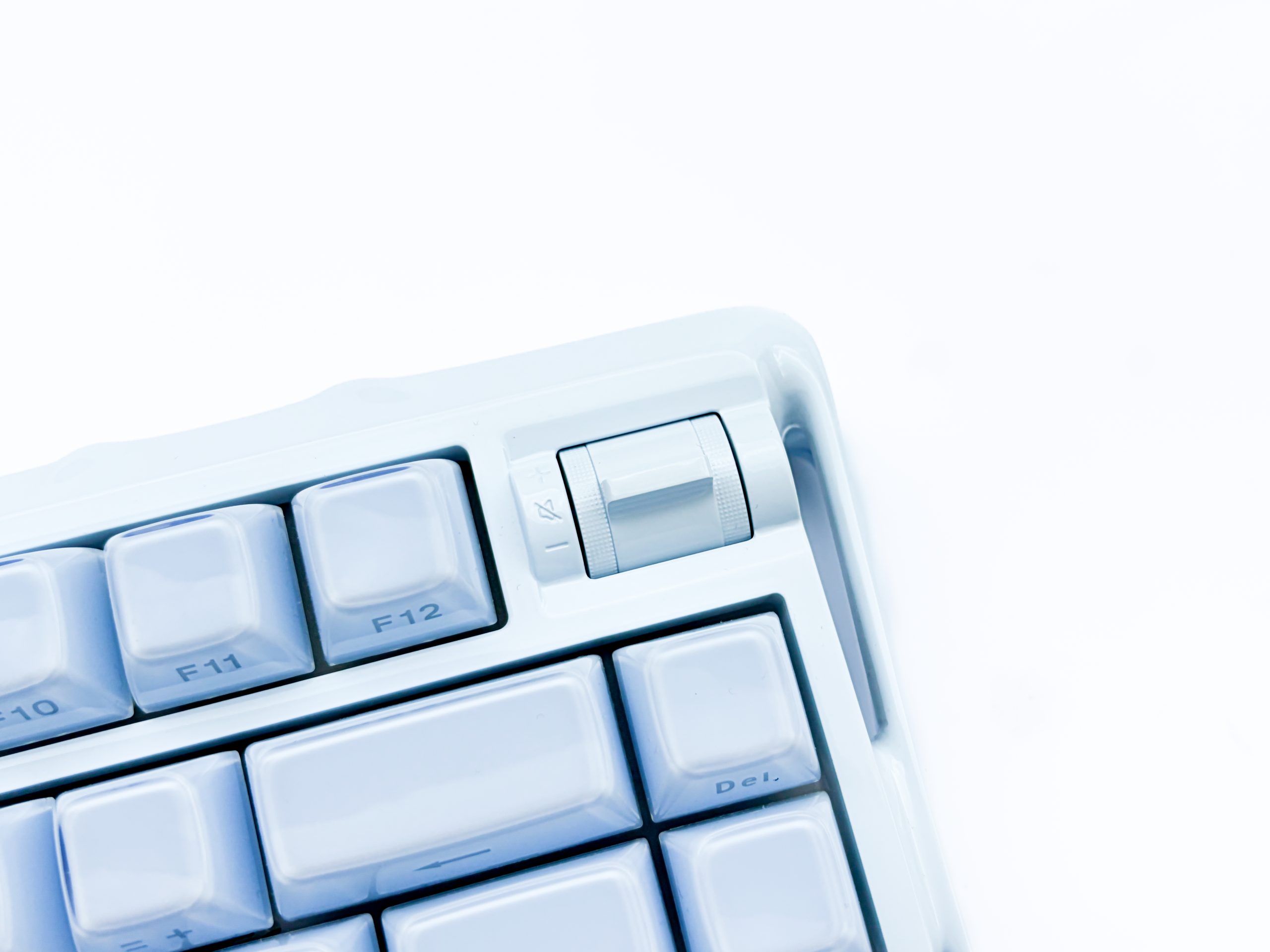 Całkowita masa Mercury K1 to 1119 gramów na mojej wadze, co jest niezłym wynikiem jak na ten format. Zawdzięcza ona to niewątpliwie obecności aluminium w konstrukcji, lecz ważnym czynnikiem są także wypełnienia obecne w środku. Naturalnie nie ma mowy o jakiejkolwiek pracy na boki w trakcie normalnego użytkowania, ani nawet gdy celowo spróbujemy wygiąć klawiaturę w rękach – jest po prostu sztywniutko jak na gitowni. Jedyny zarzut mogę mieć w zasadzie do wykończenia, bo to zapewne przy mocniejszym zderzeniu (oczywiście niecelowym, każdemu może się zdarzyć) z twardym obiektem może odpaść, a przynajmniej takie mam wrażenie obcując z tym lakierem. Mogę się natomiast mylić, bo przecież niegdyś testowana przeze mnie HMKB 95 też jest malowana (tam akurat proszkowo) i jakoś po wielu miesiącach użytkowania nadal nic jej nie dolega. Fajnie byłoby też gdyby pokrętło do regulacji głośności było lepiej spasowane, bo w moim przypadku trochę lata ono na boki, ale przynajmniej też jest metalowe. No i to trochę durny zarzut, ale muszę o nim wspomnieć – jeśli nie dbacie o porządek to nie jest klawiatura dla Was, bo serio brudzi się ona niemiłosiernie i nawet jeżeli myjecie ręce przed korzystaniem z komputera, to ślady pozostawicie na powierzchni niewątpliwie, a jeśli nie korzystacie z dołączonego nakrycia antykurzowego, to wszelkie paprochy i inne cząsteczki unoszące się w powietrzu prędko zdominują każdy cal Mercury K1, chętnie przyczepiając się do jej gładkiej, porcelanowej tekstury.