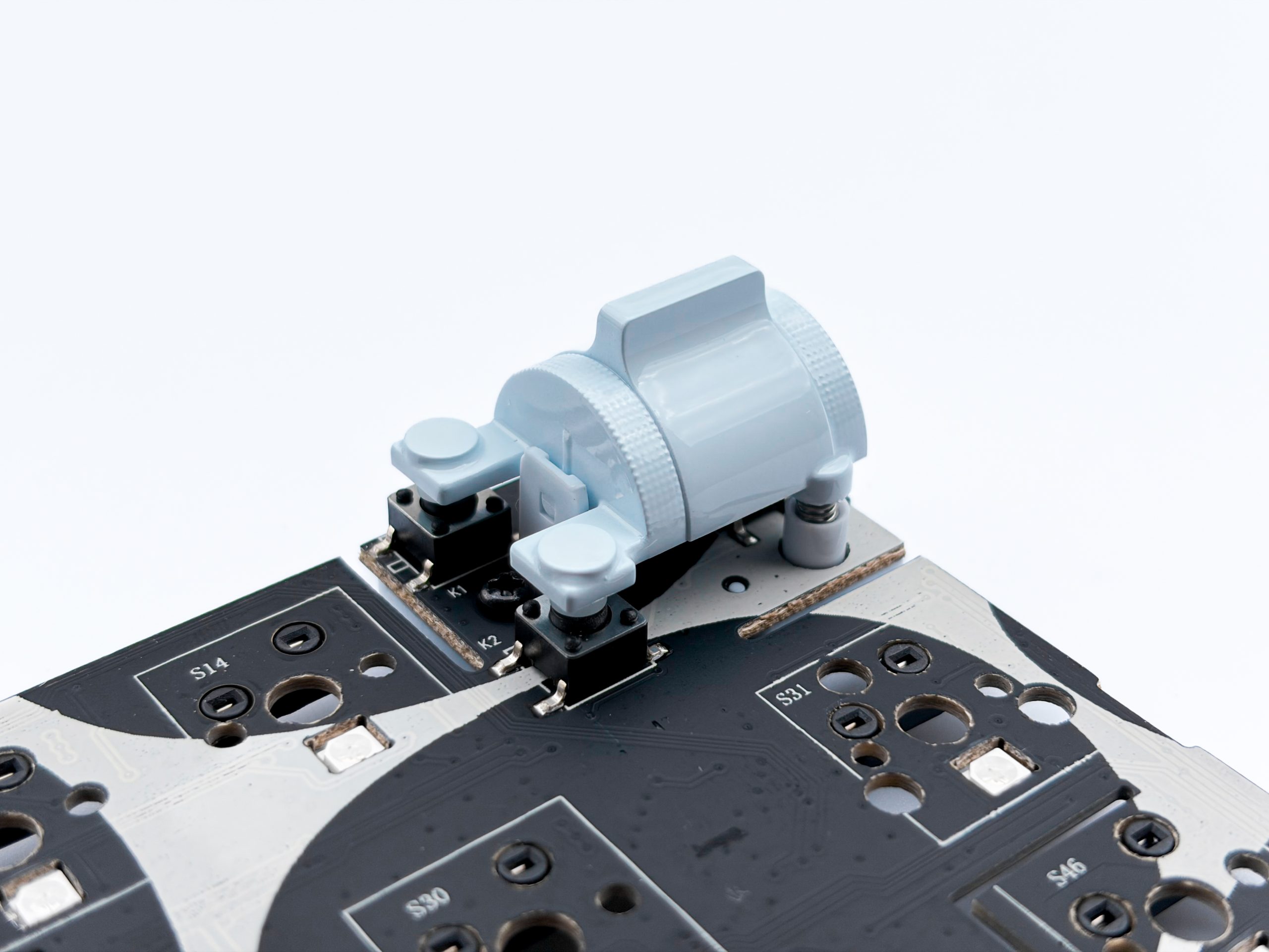 Przy fabrycznej konfiguracji, opiewającej we wszystkie wypełnienia i gasket pod spacją, nie odczujemy praktycznie żadnego ruchu. Wciskanie klawiszy jest marginalnie zmiękczone, ale równie dobrze może to wynikać z zastosowania plastikowej płytki montażowej, konkretnie z poliwęglanu, która sama w sobie zapewnia konstrukcji pewien poziom miękkości i potencjału do uginania. Żeby więc sprawdzić realny wpływ gasket mount’a na wrażenia z pisania na GravaStar Mercury K1 postanowiłem wyrzucić te wszystkie śmieci z jej środka i przetestować ją w takiej, surowszej formie. Efekty okazały się przewidywalne, choć niemniej intrygujące. Przed wszystkim niezastosowanie uszczelki tuż pod spacją zapewniło wyraźny wzrost poziomu uginania w sekcji alfanumerycznej, natomiast przykręcenie niebieskiego plasticzku skrywającego „rolkę” do obudowy spowodowało powstanie hard spotu w okolicy prawego górnego rogu. Mógłbym to naturalnie zniwelować pozostawiając śrubę nieprzykręconą, ale wówczas wciskanie rolki powodowałoby brzydkie uginanie się jej wraz z PCB, a przy tym prawdopodobnie interferencję z korpusem. Spodziewałem się znacznego wzrostu wyczuwalnego odbijania na przestrzeni całej klawiatury, szczególnie biorąc pod uwagę jak pocięta jest płytka montażowa i ta drukowana, ale szczerze powiedziawszy nie wziąłem pod uwagę jak twarde silikony zastosował producent. Ogólnie rzecz biorąc GravaStar Merucury K1 zachowuje się po wprowadzonych modyfikacjach naprawdę satysfakcjonująco i o ile myślałem, że poziom uginania będzie jeszcze większy, to i tak korzystało mi się z niej wybitnie. Nie jest to też rzecz jasna F1-722 czy inna wybitna klawiatura za pięciokrotność testowanego dziś sprzętu, ale gdybym miał do dyspozycji tylko kilka stówek, to wcale bym takim nie pogardził – oczywiście w tej konfiguracji, bo z piankami jest istna padaka.