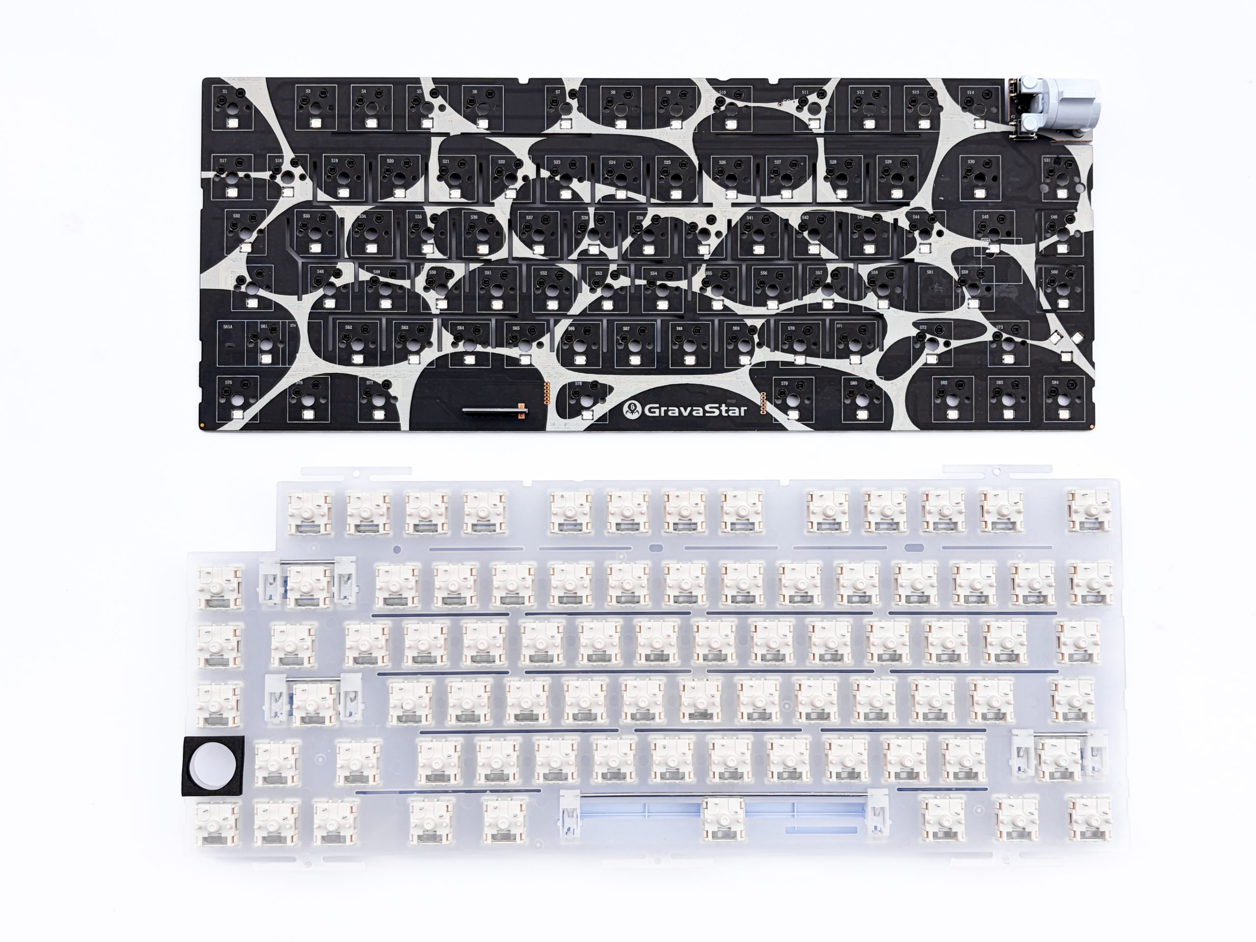 Jeżeli chcemy brnąć dalej, to następnym krokiem będzie odkręcenie płytki-córki i odłączenie tasiemki łączącej ją z faktycznym PCB, w którym osadzone są przełączniki. Musimy też odkręcić jedną śrubkę w miejscu niebieskiego kwadratu, który skrywa mechanizm „rolki” do regulacji głośności. Po tych czynnościach jesteśmy w końcu w stanie wysunąć PCB+plate assembly z metalowej ramy, co odkrywa nam między innymi obecność kolejnych dwóch pianek wypełniających po brzegi przestrzeń między PCB i płytą montażową – jedna to cienka warstwa IXPE uwydatniająca brzmienie, a druga to zwykły poron (niskoporowaty) zabijający pogłos i wysokie częstotliwości. Co najlepsze, GravaStar wepchnął tam nawet jeszcze cieńszą warstwę plastiku PET, tego samego co w butelkach, który chyba też ma na celu separować przełącznik od PCB i w ten sposób zmieniać generowany przez klawiaturę dźwięk, ale z doświadczenia wiem, że efektywność takiego działania jest wątpliwa. Moje podejście do pianek i innych tego typu wypełniaczy raczej znacie, więc tutaj zastanówmy się po prostu co chciał osiągnąć producent. Zważając na ilość pianek i ich niską porowatość oraz obecność grubego silikonu, GravaStar ewidentnie celował w basowe brzmienie. IXPE to po prostu PE foam i jego zadanie każdy zna – przełącznik staje się głośniejszy i bardziej „””marmurkowy”””, co część klientów bardzo lubi. No i echo jest tutaj kompletnie zabite przez zapełnienie każdego zakamarka, przez co fale dźwiękowe po prostu nie mają gdzie się nieść, zamiast tego odbijając się i lecąc bezpośrednio do naszych uszu.