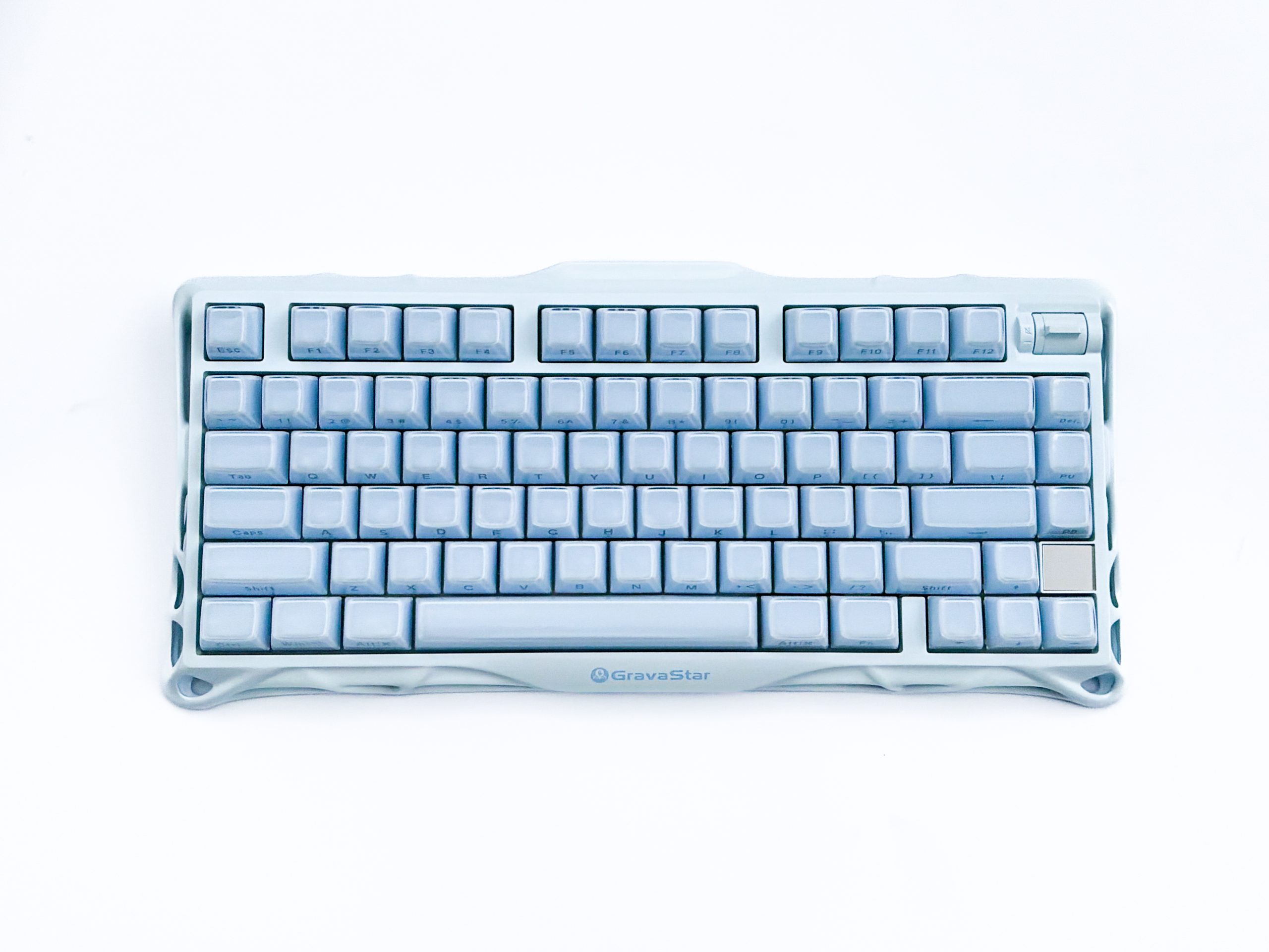 GravaStar Mercury K1 to kolejna na rynku klawiatura w rozmiarze 75% i to tym lepszym, bo exploded. To znaczy tak jakby, bo w exploded chodzi o to, że każda sekcja jest od siebie oddzielona przerwą, a tutaj w zasadzie tylko rząd funkcyjny odstaje od reszty. Strzałki są połączone, klawisze nawigacyjne też, ale nie było to aż tak ciężkie do nauczenia dla moich palców, więc przymykam na to oko. Dostajemy też dwa blockery, czyli te puste przestrzenie pomiędzy Fn i lewą strzałką oraz prawą strzałką i PageDown – po to żeby celniej trafiać. Jest to też swego rodzaju wyraz stylistyczny, który jednym się podoba, a inni porównują go do przerwy między zębami. Ja osobiście lubię blockery, choć nie przepadam za formatem 75%, bo ten po prostu mnie ogranicza nie dając mi nic w zamian, a do tego całościowo wygląda po prostu okropnie. Jestem od lat fanem TKL-i i to do ich funkcjonalności się przyzwyczaiłem, a takie ściskanie klawiszy żeby za wszelką cenę oszczędzić kilka centymetrów na biurku jest dla mnie paranoją – ale oczywiście co kto lubi, broń Boże nie zakazuję Wam lubić tego rozmiaru.