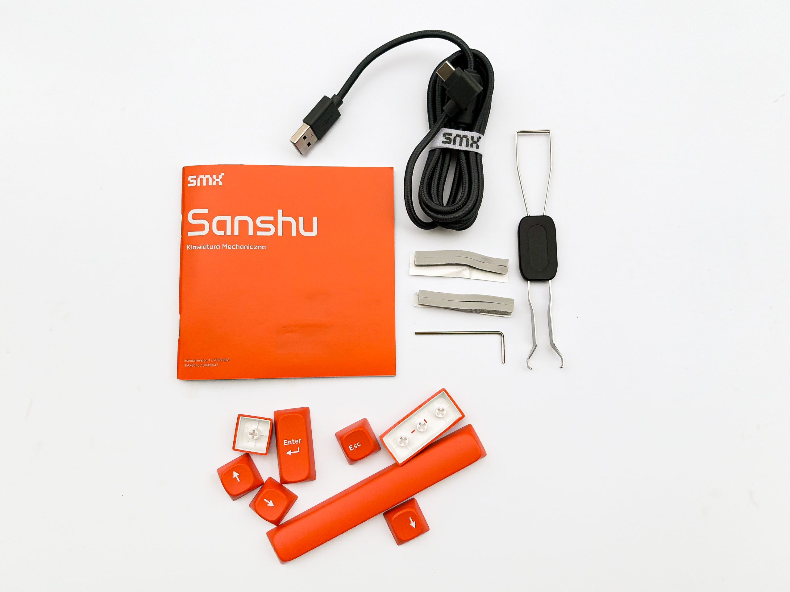 Fajnie że kabel jest zwinięty na rzep, dzięki czemu łatwo go przechowywać gdy nie jest użytkowany, ale dlaczego zawiera kątowe złącze typu C, skoro sama klawiatura ma ów port na tyle obudowy? Wygląda to jak jakieś nieporozumienie, błąd lub zmiana projektu. Sam oplot to miły gest, ale szkoda że jest czarny – w końcu samo urządzenie nie zawiera tej barwy, więc wygląda to nieco dziwnie po podpięciu. Narzędzie do wyciągania nakładek jest druciane, więc nie uszkodzimy nim niczego, zaś to do przełączników używa się z akceptowalnym poziomem wygody przez wykonanie go z grubej blachy. Gratisowe pianki służą do uszczelkowego montażu wykorzystanego w SMX Sanshu i są naprawdę miłym gestem, bo podczas modyfikowania można po prostu coś zepsuć i byłoby przykro gdyby zabrakło nam przez to gasketa. Imbus jest zaś jasną informacją, że możemy swobodnie otwierać to urządzenie bez utraty przy tym gwarancji, co także pokazuje jak daleką drogę zaszliśmy w świecie klawiatur mechanicznych. Bonusowe nakładki pozwalają z kolei na ożywienie domyślnej formy Sanshu poprzez dołożenie jej trochę kolorytu, a do tego nie zawierają żadnych durnych nadruków, tylko standardowe legendy.