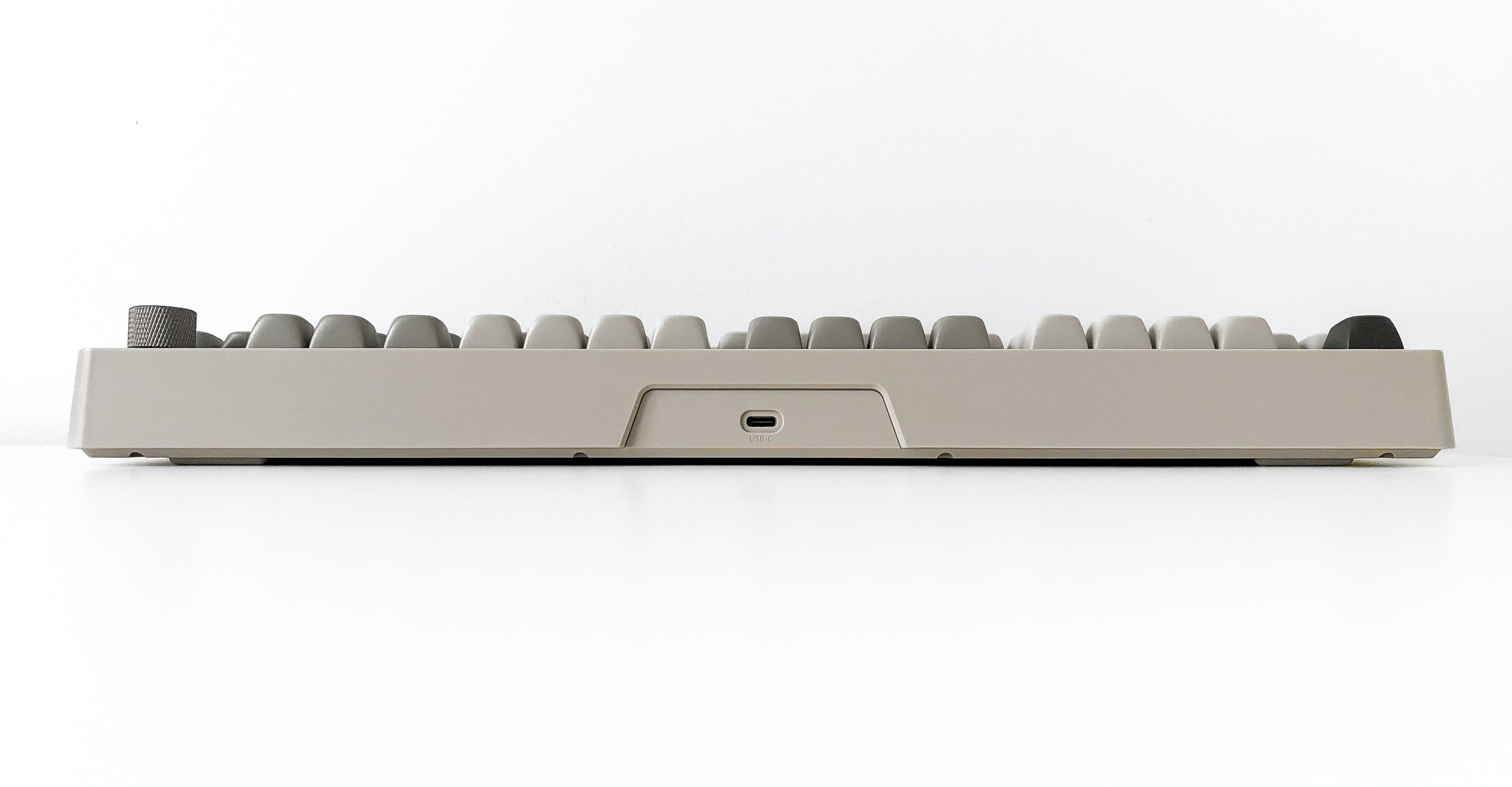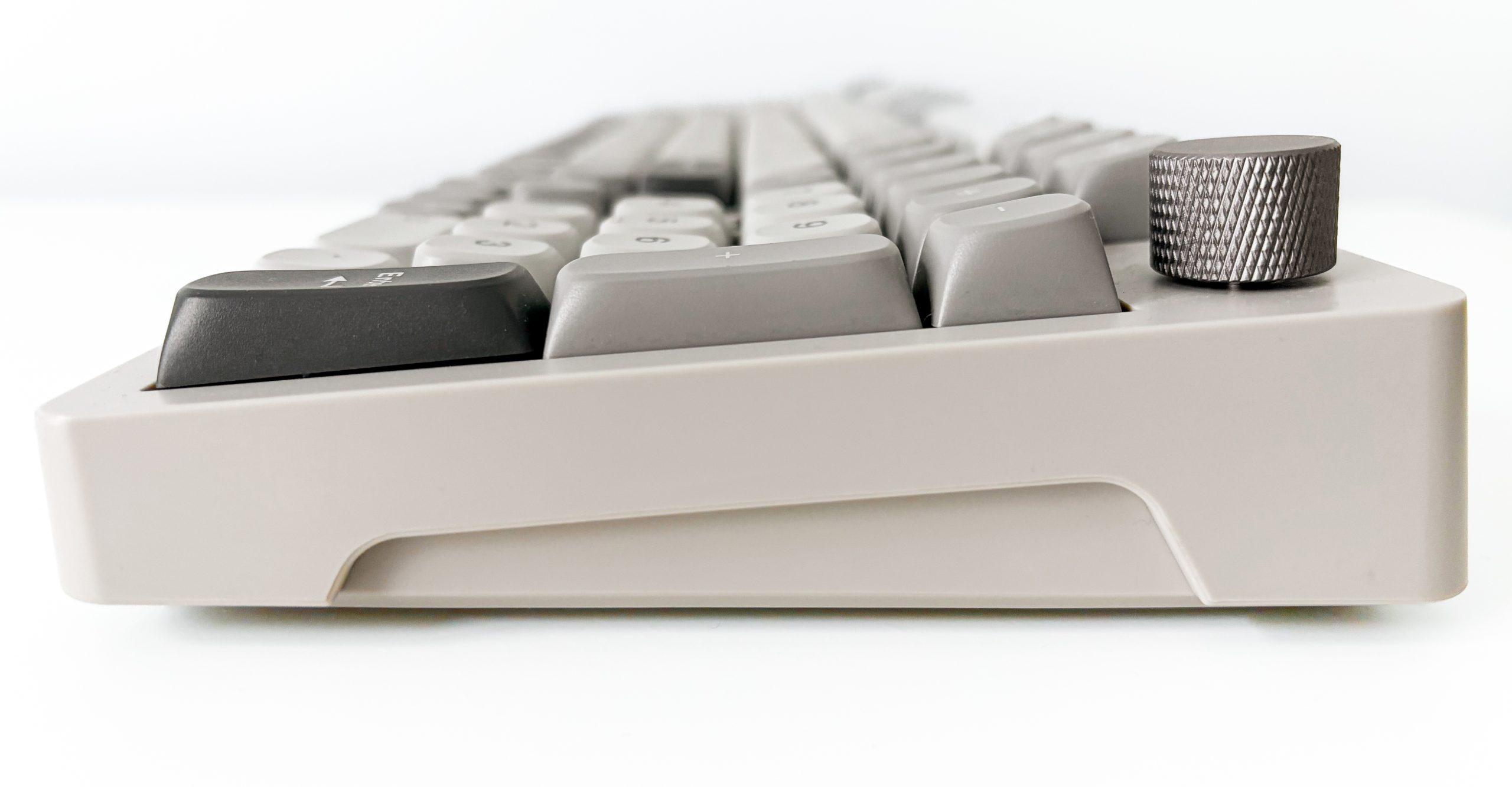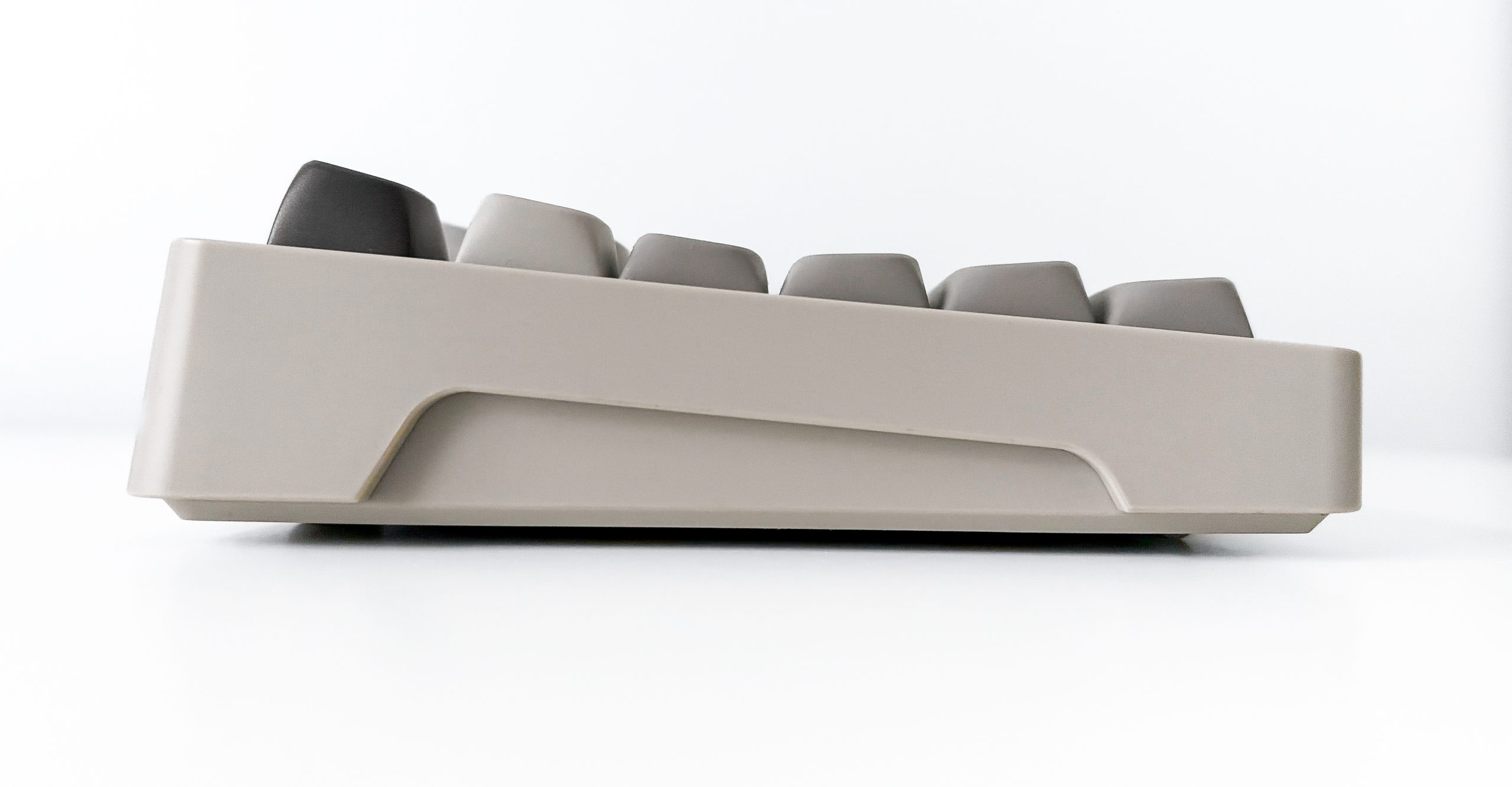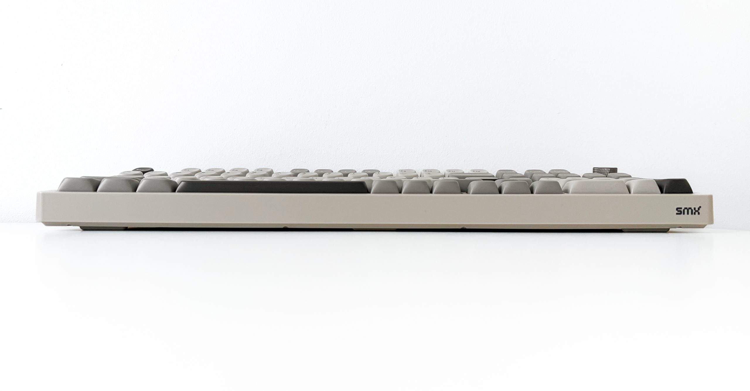 Ostatnie lata opiewają we wzrost zainteresowania sprzętem retro lub chociaż go przypominającym. Gdzie nie spojrzę, ludzie wracają do urządzeń służących do konkretnych zadań (np. aparat fotograficzny, telefon z klapką czy iPod), rośnie popularność winyli, płyt kompaktowych i kaset, a także chociażby konsol pokroju GameBoy. Na temat tego dlaczego tak się dzieje możnaby się rozwodzić godzinami, ale dzisiaj nie będziemy tego robić. Nie przytaczam jednak takiej obserwacji bez powodu, bowiem testowana dzisiaj SMX Sanshu bezpośrednio stara się nawiązywać do dawnych dziejów, gdy klawiatury były beżowe, a ich nakładki obłe. Widać to natychmiast, już na pierwszy rzut oka – calutkie urządzenie ma barwę kojarzoną z zeszłym wiekiem i klawiaturami wówczas produkowanymi. Nie jest to jednak taki beż jak wtedy, a zamiast tego coś bardziej zbliżonego do szarości – co szczególnie uwidaczniają kompletnie niebeżowe modyfikatory oraz grafitowe akcenty. Kształt obudowy nie jest urzymany w podobnej stylistyce, bowiem zamiast wszechobecnych obłości dostajemy zaokrąglone rogi i.. tyle. Powierzchnia jest płaska z każdej możliwej strony, ranty stosunkowo ostre bez żadnych frezów czy łagodnych zagięć, a ramki dookoła klawiszy prawie idealnie symetryczne (bowiem ta dolna jest nieco grubsza, przez wzgląd na odstające strzałki). Ponadto nie są one tak grube jak kiedyś, zamiast tego starając się utrzymać Sanshu we w miarę kompaktowej formie.