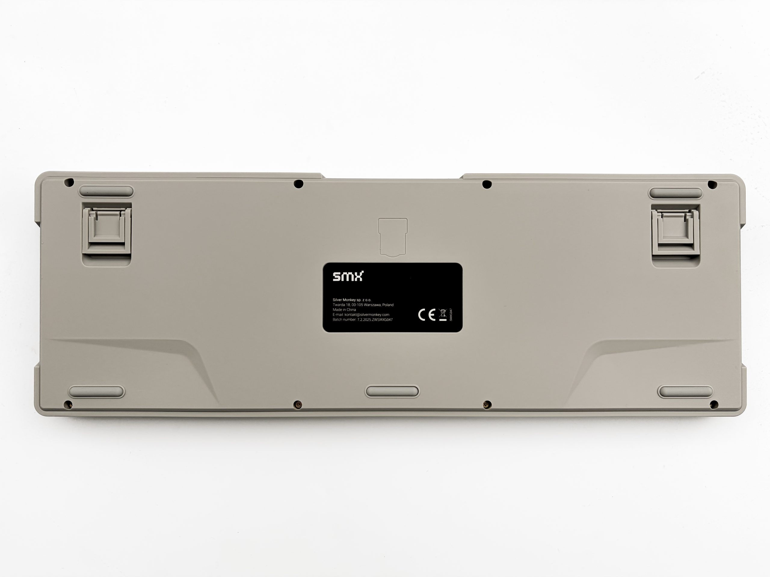 Pisząc o tej płaskości każdego boku trochę skłamałem, bo wystarczy rzut na profil recenzowanego urządzenia żeby dostrzec wcięcie służące do łatwego złapania go w przypadku chęci przeniesienia go w inne miejsce. Podobny zabieg producent wykonał na tyle, lecz tam wcięcie ma za zadanie wskazać wyśrodkowane złącze USB-C, tak żebyśmy wiedzieli gdzie się ono znajduje i zawsze celnie w nie trafiali. Na spodzie korpusu znajdziemy pięć sensownie rozlokowanych gumek antypoślizgowych w identycznym kolorze co reszta klawiatury, ogromną i niestety czarną (to znaczy mogła być beżowa, dlatego niestety) naklejkę z numerem seryjnym oraz ciekawie wyglądający zarys, tak jakby na adapter 2,4 GHz. Widać zatem, że SMX albo chciało pierwotnie dać nam tutaj bezprzewodowość, ale finalnie z niej zrezygnowało, albo za pewien czas dostaniemy odświeżony model w tej samej obudowie, lecz z akumulatorem w jej środku. Płaską powierzchnię naruszają także dwa łagodnie zejścia przy frontowej krawędzi, mające rolę wyłącznie estetyczną o wątpliwym sensie. Widać tu także osiem otworów, w których środku świecą się śrubki o główkach korespondujących z imbusem dołączonym w zestawie. Jejku, jak miło zobaczyć dbanie o klienta chcącego modyfikować klawiaturę na własną rękę i brak blokad dostępu do jej wnętrza jakimiś durnymi zatrzaskami czy poukrywanymi pod keycapami śrubami.