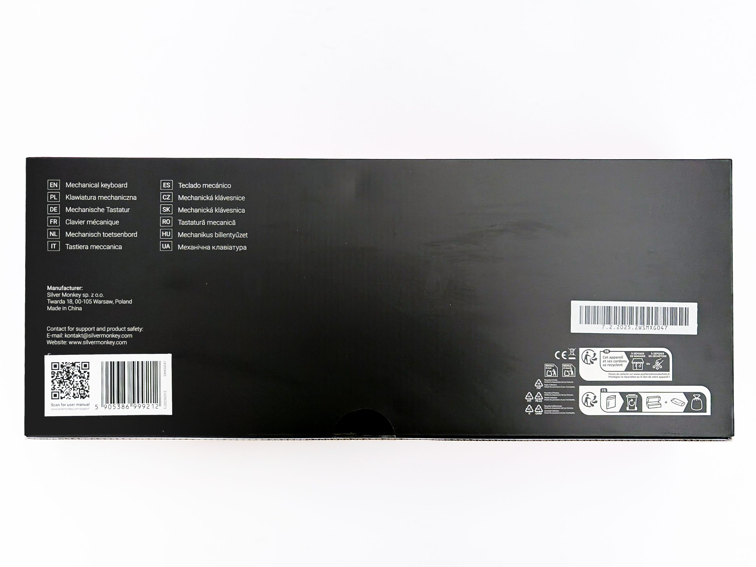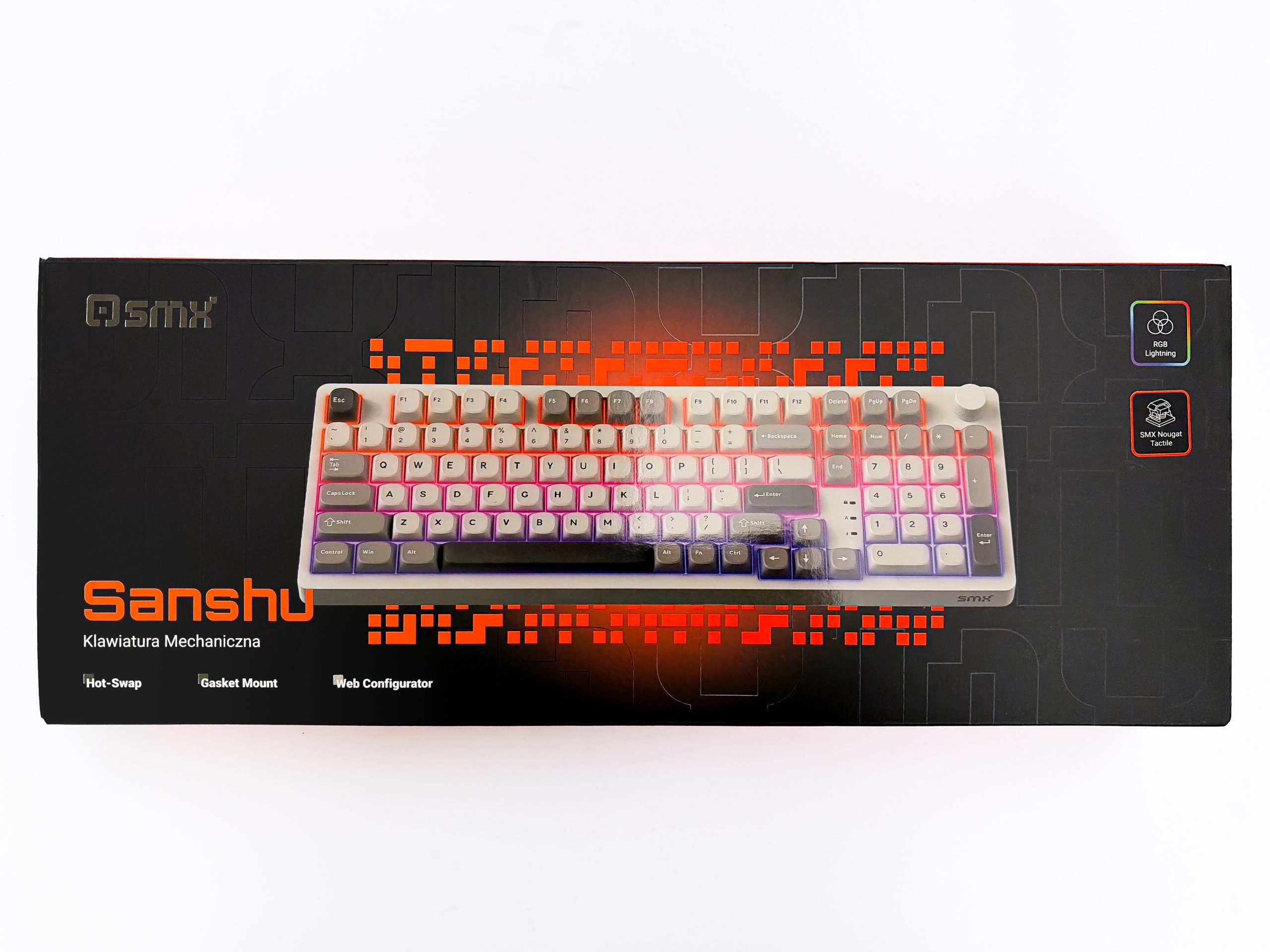 Klawiatury tego typu, jak ta będąca dzisiejszym gościem, są sprzętem raczej kierowanym do klienta internetowego – nie muszą zatem mieć wyjątkowo rzucającego się w oczy kartonu. Niemniej x-kom posiada swoje sklepy stacjonarne, a co za tym idzie SMX Sanshu powinna być w nich eksponowana na tyle dobrze żeby klienci byli w stanie dostrzec ją swoim wzrokiem i prędko popędzić z pudełkiem do kasy, oczywiście ówcześnie czytając co na opakowaniu się znajduje i chłonąc w ten sposób wszystkie najważniejsze dane. Czarne pudełko może zatem zdawać się złym pomysłem, lecz poza tym ciemnym tłem na froncie znajdziemy kolorowy nadruk prezentujący skrywające się wewnątrz urządzenie w akompaniamencie czerwonych wzorków. Po jego lewej stronie widnieje logo producenta, nazwa modelu i trzy kluczowe cechy – hot-swap, gasket mount i konfigurator przeglądarkowy. Po prawej są z kolei dwa emblematy, których dodawanie jest swoistą tradycją u producentów sprzętu gamingowego, informujące o obecności podświetlenia RGB oraz przełączników SMX Nougat Tactile. Rewers jest natomiast wyjątkowo smutny, gdyż nie ma tam absolutnie nic. Tak: czarne tło, kod kreskowy, tekst „klawiatura mechaniczna” w dwunastu językach i adres siedziby marki, to wszystko co tam znajdziemy. Brakuje mi tu trochę jakiejś specyfikacji, nawet takiej prostej; ale może oszczędność na opakowaniu daje nam lepsze wnętrze 😉