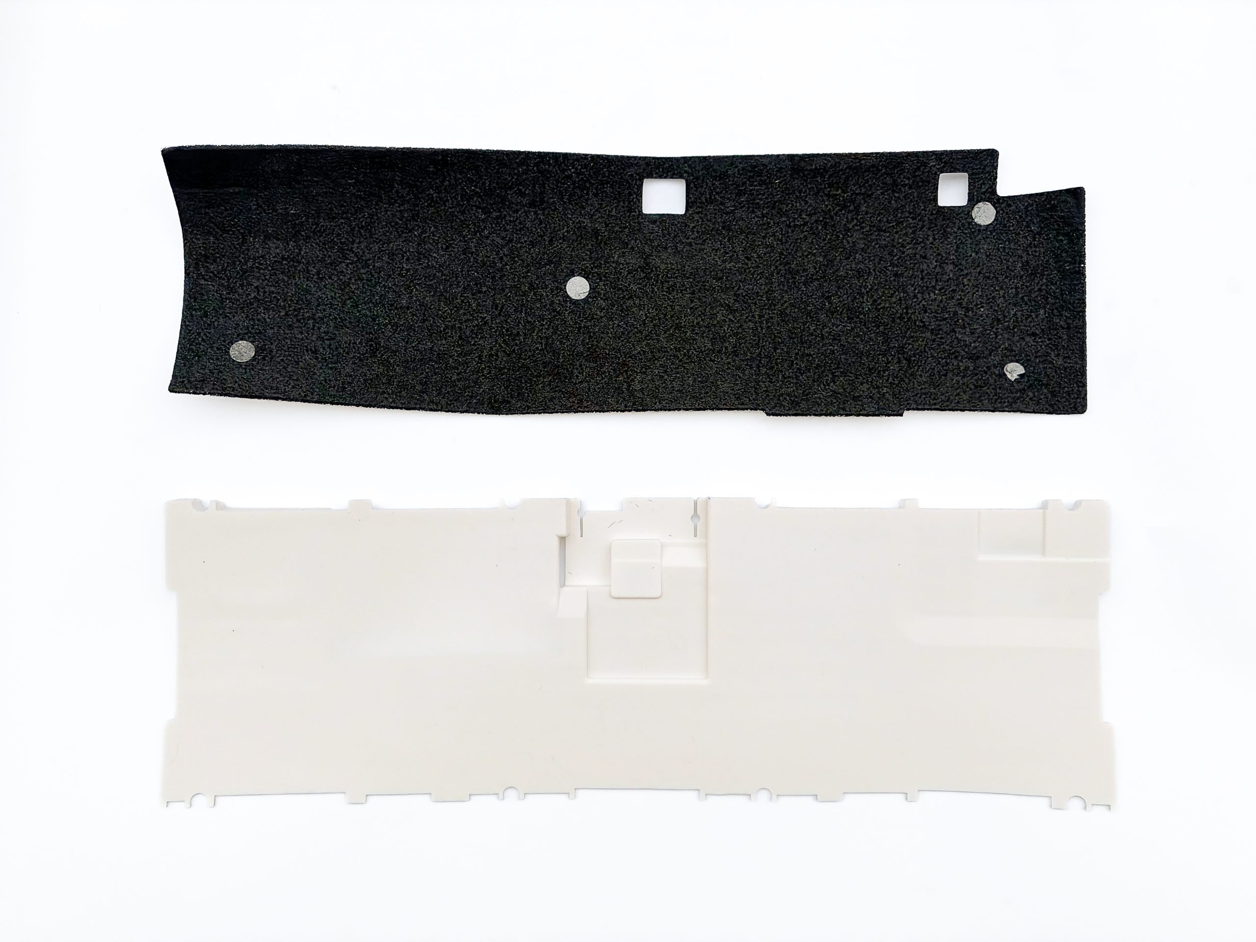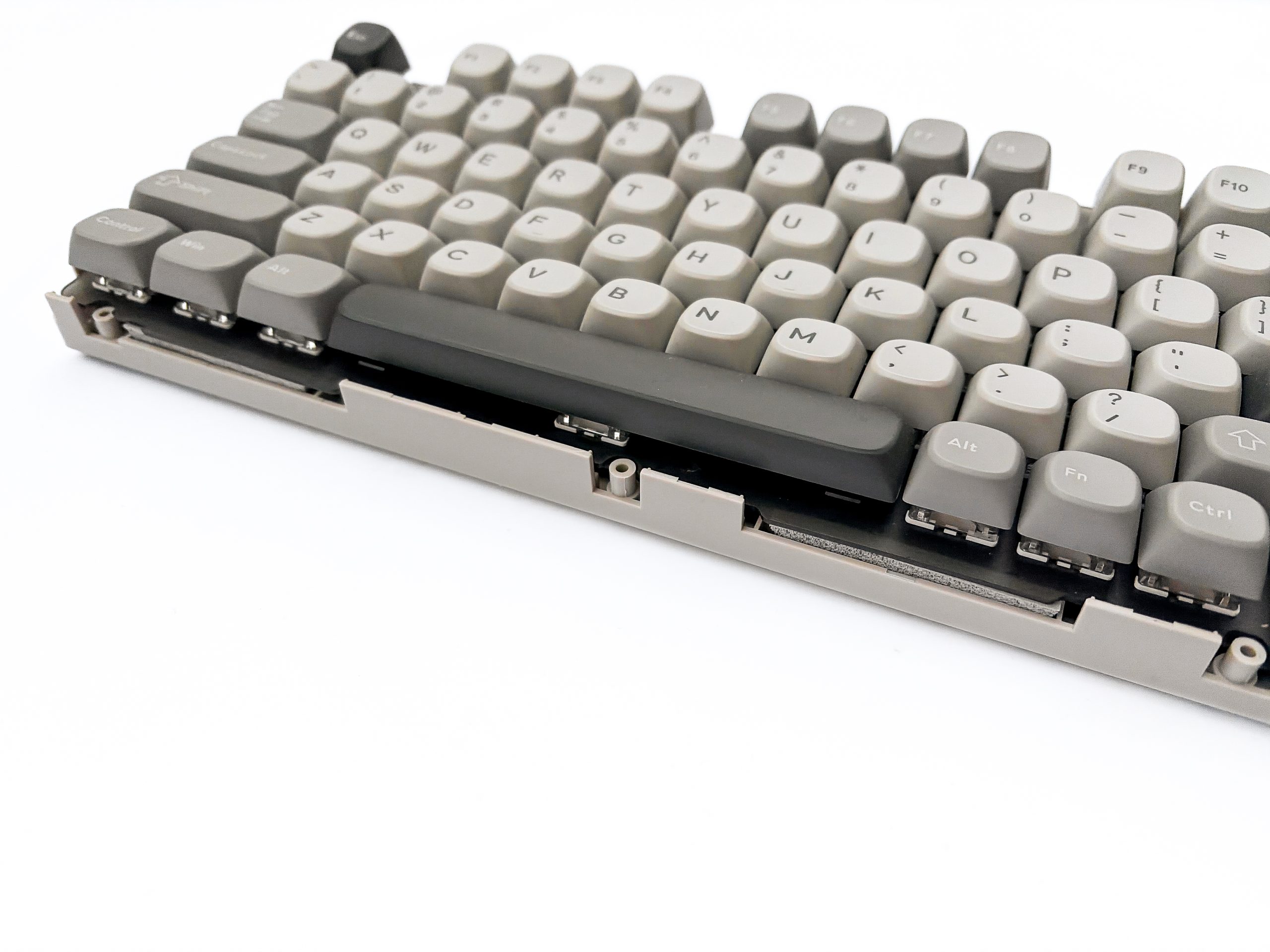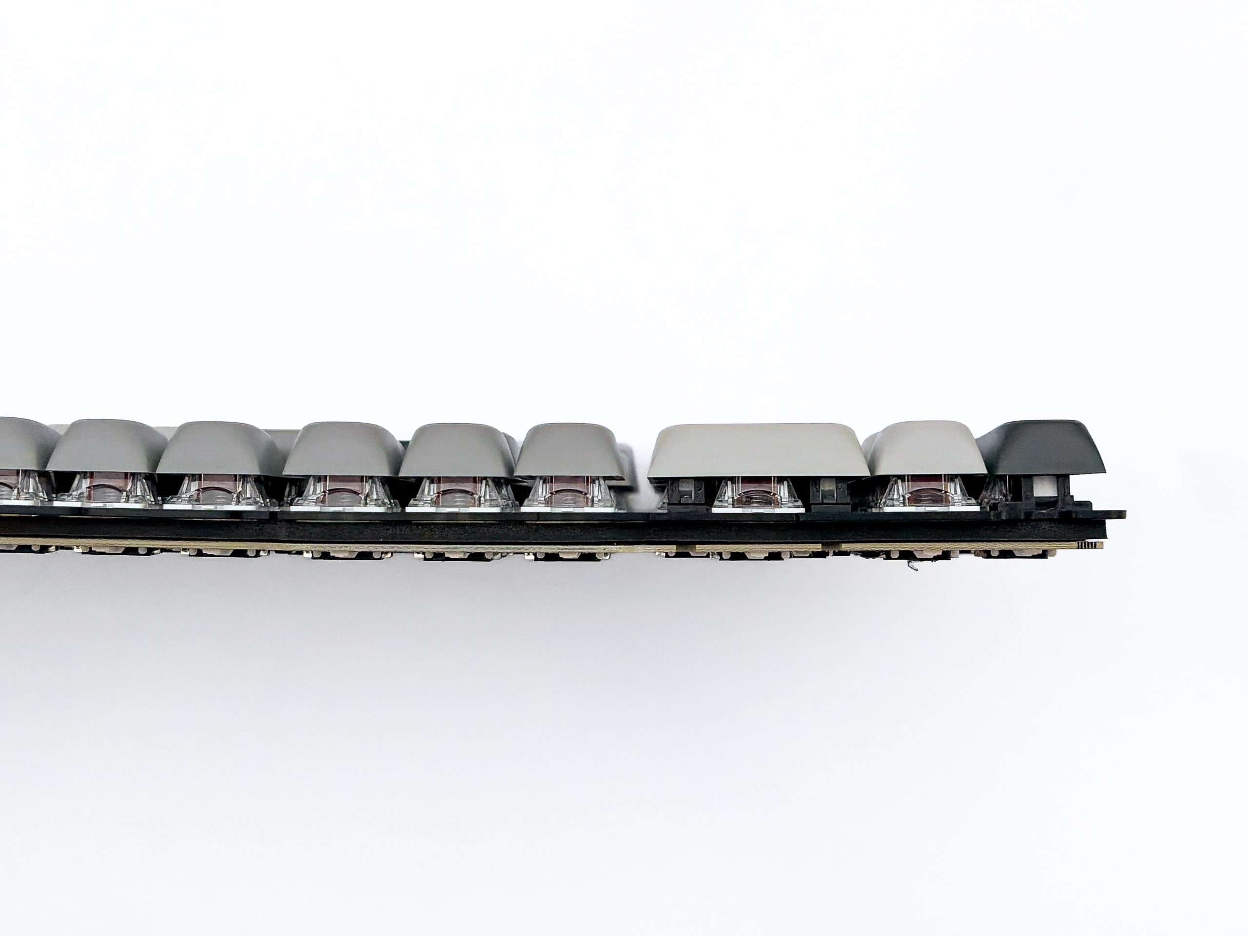 Pierwszym co rzuca się w oczy to rzecz jasna ilość wypełniaczy, w tym ogromny kawał białego silikonu na samym spodzie. Do spodu płytki drukowanej przyklejona (na szczęście słabo i da się ją z łatwością odkleić) jest z kolei czarna pianka połączona z plastikiem typu PET. Pomiędzy PCB, a płytką montażową są z kolei kolejne dwie pianki, jedna gęsta i tłumiąca wibracje pomiędzy tymi częściami, a druga cieniutka PE, mająca na celu blokować przełączniki przed bezpośrednim kontaktem z powierzchnią płytki drukowanej, rzecz jasna w celu osiągnięcia konkretnego zabarwienia dźwiękowego.