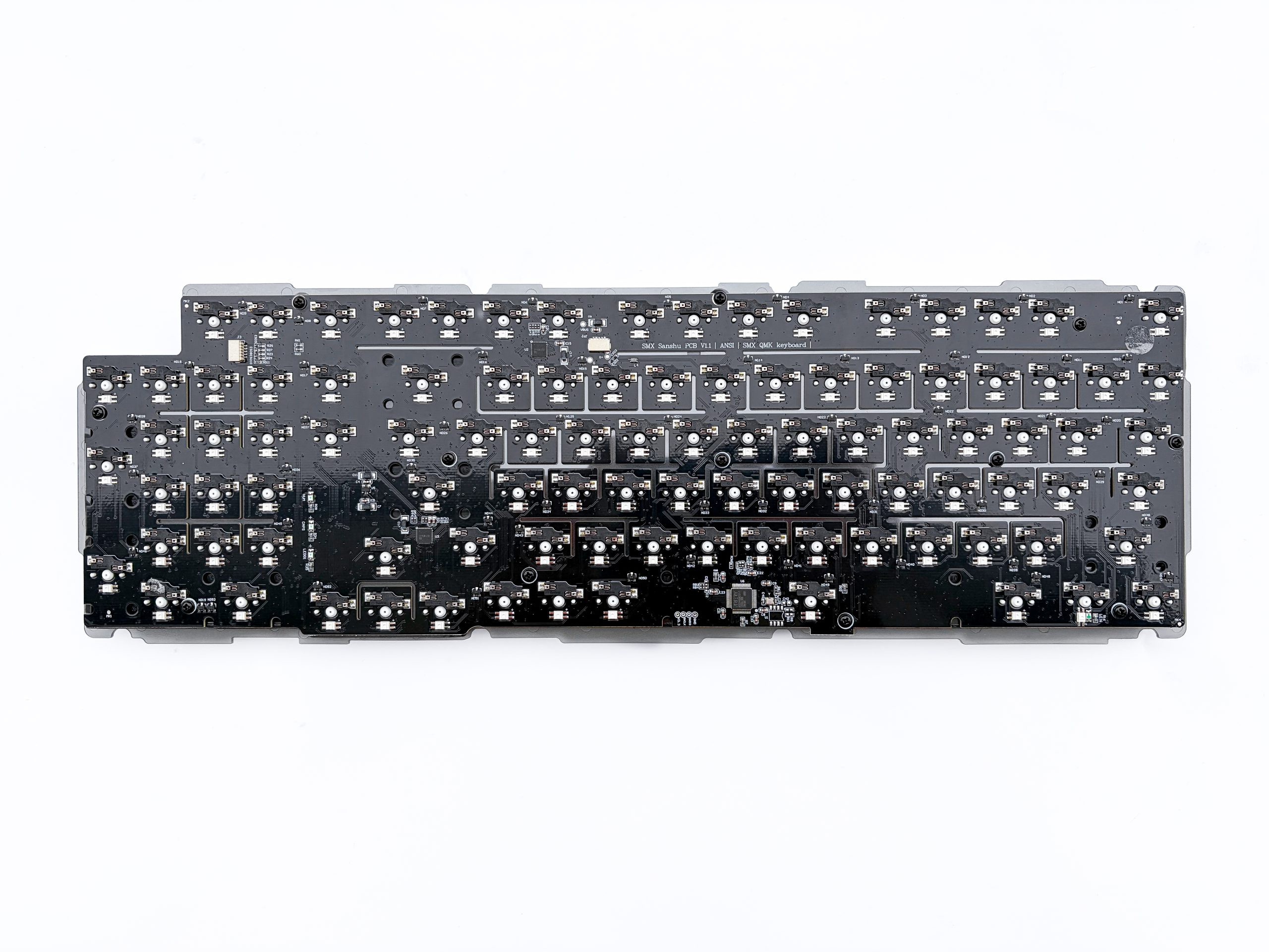 No, to teraz wreszcie przyszła pora żebym ponarzekał sobie na stosowanie gasket mount’a w klawiaturze za 250 złotych wypchanej piankami i silikonami. Ostatnie lata pokazały, że tray mount powoli umiera i coraz więcej producentów decyduje się na implementowanie montażu uszczelkowego w swoich sprzętach, jednocześnie obniżając próg wejścia. Obecnie nawet jedne z najtańszych propozycji klawiatur na switchach MX style oferują jakąś formę odseparowania płytki montażowej od reszty konstrukcji za pomocą gumek lub pianek, co według marketingu przy nich stosowanego ma skutkować w poprawie brzmienia i ogólnych wrażeń dotykowych z użytkowania. SMX Sanshu także wykorzystuje gasket mount i robi to w oparciu o odstające na krawędziach plastikowej płytki skrzydła, które są trzymane z obu stron przez pianki przyklejone w dedykowanych miejscach wnętrza korpusu. Wszystko super, jest to akceptowalne rozwiązanie i niektóre modele lubiane przez entuzjastów także tak działają. Rzecz w tym, że tuż pod PCB jest napchane akustycznych wypełniaczy, przez co po pierwsze nie da się zauważyć realnej korzyści w kwestii dźwięku (bo i tak wszystko jest już wytłumione, więc nie da się wytłumić bardziej), a po drugie uginanie czy jakakolwiek praca PCB+plate assembly tu po prostu nie istnieje. Gdyby wyrzucić wygłuszacze to całość miałaby miejsce na jakikolwiek ruch, w wyniku czego poczulibyśmy ten mityczny flex kojarzony z gasketem, a do tego usłyszelibyśmy realną poprawę względem popularnego tray mount’a, polegającego na przykręceniu płytki drukowanej do obudowy, w losowych miejscach. Jedynym atutem montażu uszczelkowego w SMX Sanshu jest więc równiejszy feeling, to znaczy pozbawiony hard spotów – bo na to faktycznie cierpią klawiatury oparte o tray, a gasket skutecznie to eliminuje.