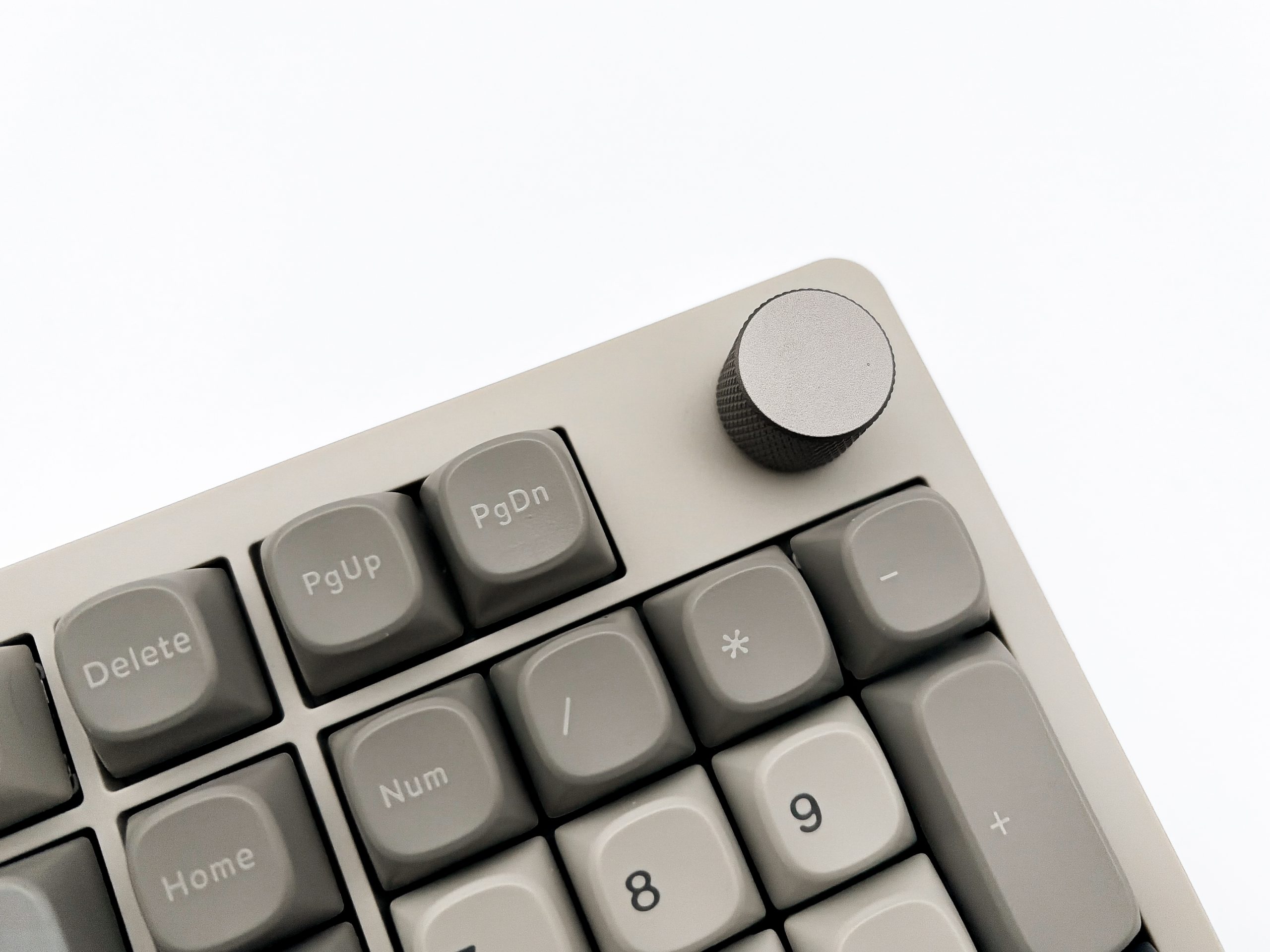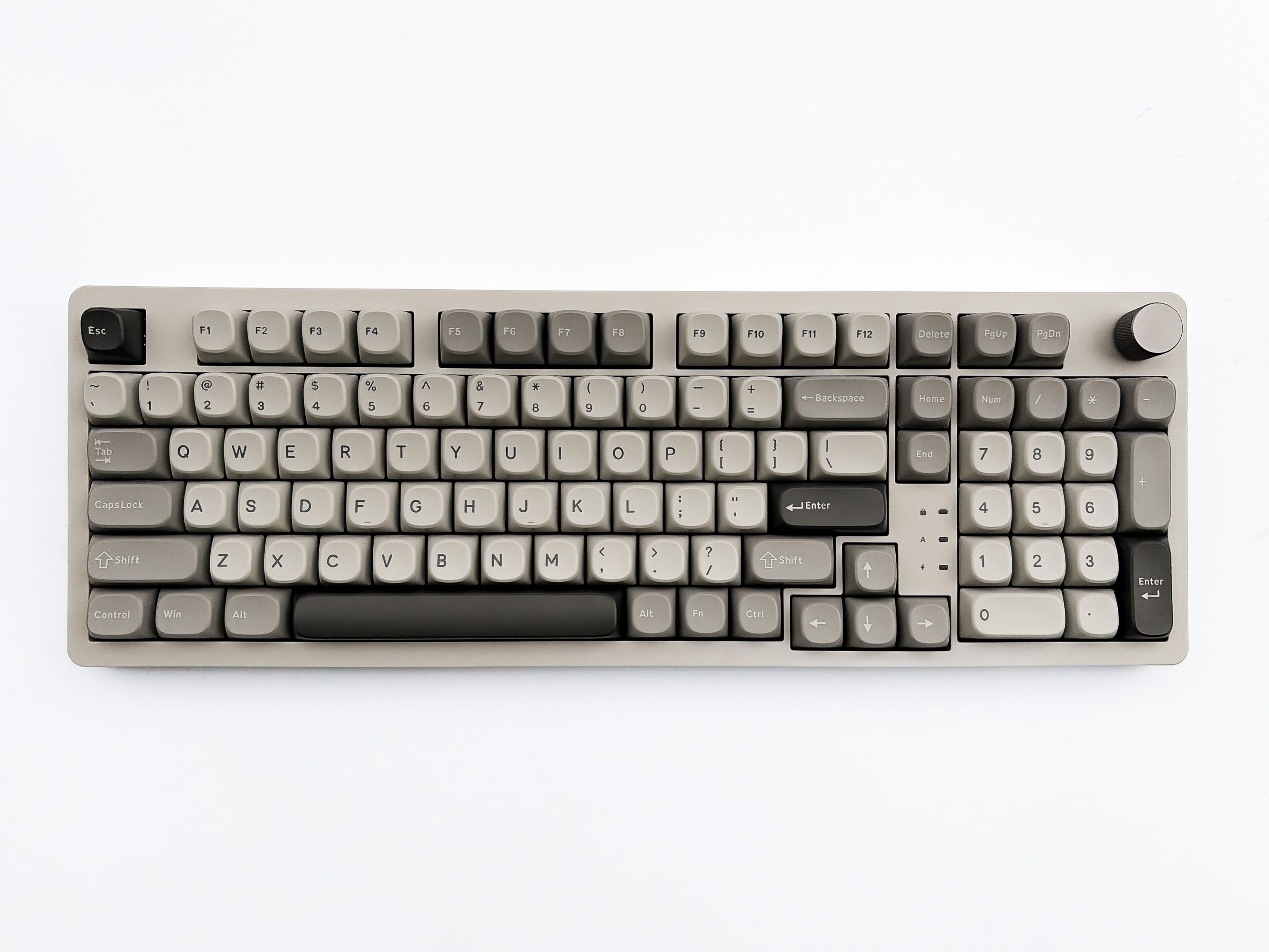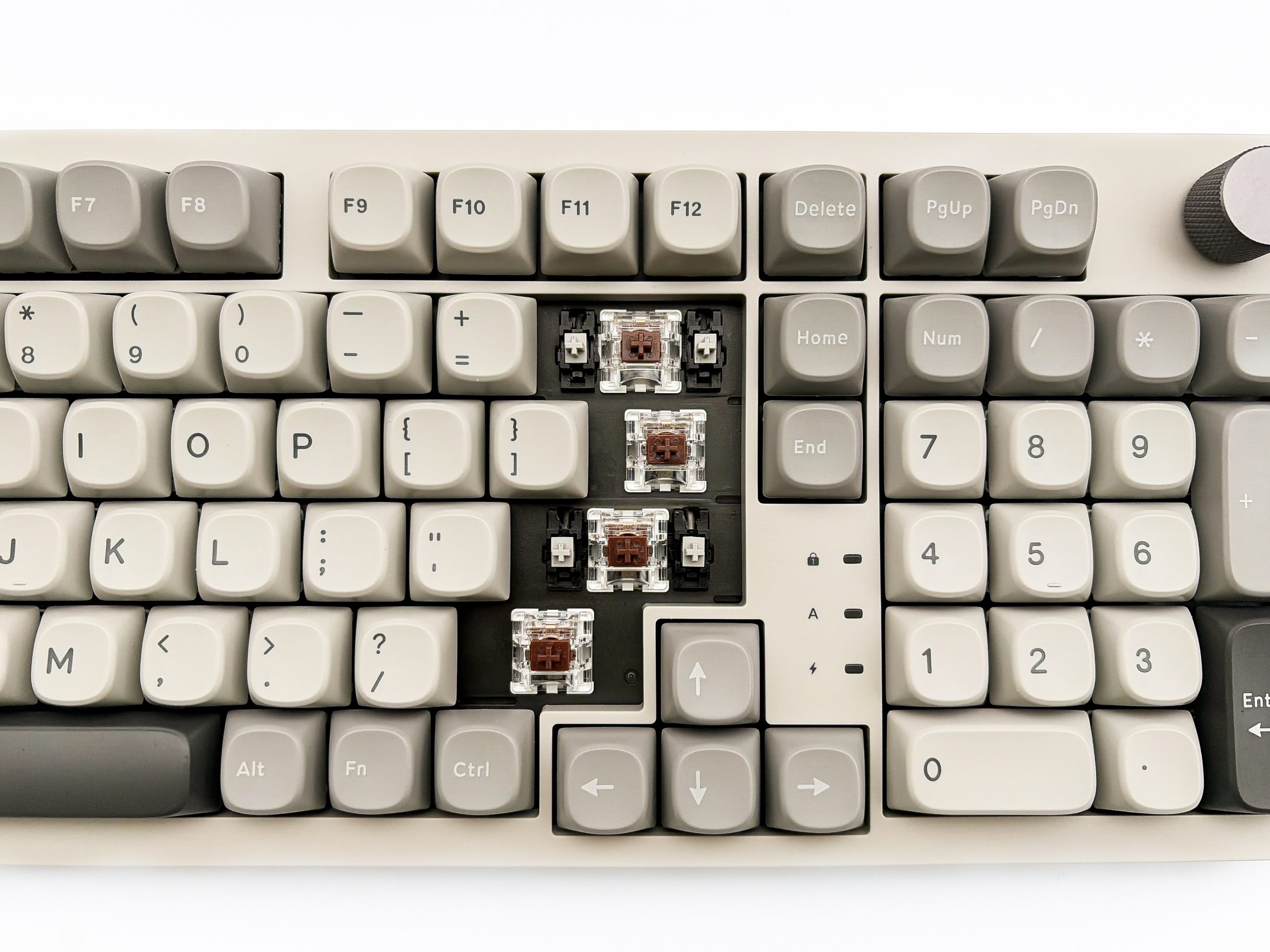 SMX Sanshu to druga z rzędu klawiatura recenzowana na łamach mojego bloga, która korzysta z rozmiaru nazywanego przez wielu jako 98%, co niezmiernie mnie cieszy – bardzo lubię bowiem urządzenia z NumPadem, a gdy producent decyduje się zredukować miejsce zajmowane na biurku stawiając na kompaktowość, to nie mogę przejść obok tego obojętnie. Jestem jednak fanem konkretnie 980 i 1800, czyli formatów znanych z kolejno Leopold FC980C i Cherry G80-1800. Tutaj mamy natomiast do czynienia z czymś odrobinę innym, bo z nieco nowocześniejszym podejściem. Sekcja alfanumeryczna jest prawie nienaruszona, poza skróceniem prawego Shifta i klawiszy znajdujących się tuż pod nim, celem wciśnięcia tam jeszcze fizycznych strzałek. Rząd klawiszy funkcyjnych także jest obecny w znanej nam formie, z niewielką przerwą oddzielającą go od reszty, a także bez F13 – czyli z normalnymi odstępami zamiast symetryczności. Ciekawie jest jednak po prawo, bowiem to tam producent wcisnął trzy przyciski z klastra nawigacyjnego, a także zrobił przerwę na lampki kontrolne. Dalej jest zaś NumPad w najzwyklejszej postaci, natomiast nad nim umiejscowione zostały kolejne dla klawisze nawigacyjne, a także pokrętło, lecz z przerwą wydzielającą je od reszty. Jak więc widzicie, jest tu trochę inaczej niż w wymienionych wcześniej modelach, ale za to efekt jest praktycznie taki sam – utrzymując kompletną funkcjonalność klawiatury, nie zabierając nam praktycznie żadnego przydatnego w codziennym użytkowaniu komputera klawisza, zyskujemy ociupinkę więcej miejsca na biurku poprzez to wykluczenie normalnego klastra nawigacyjnego.