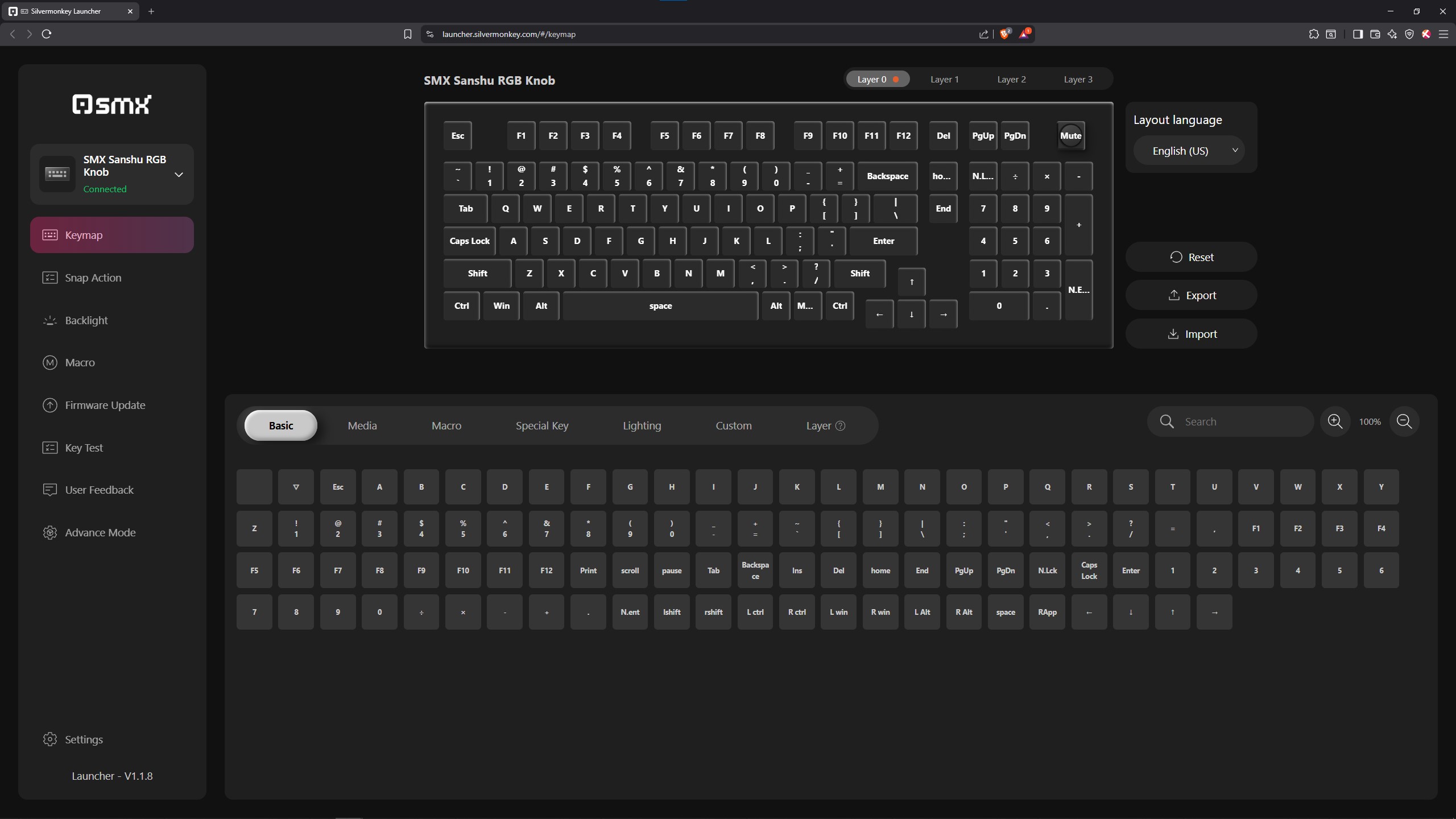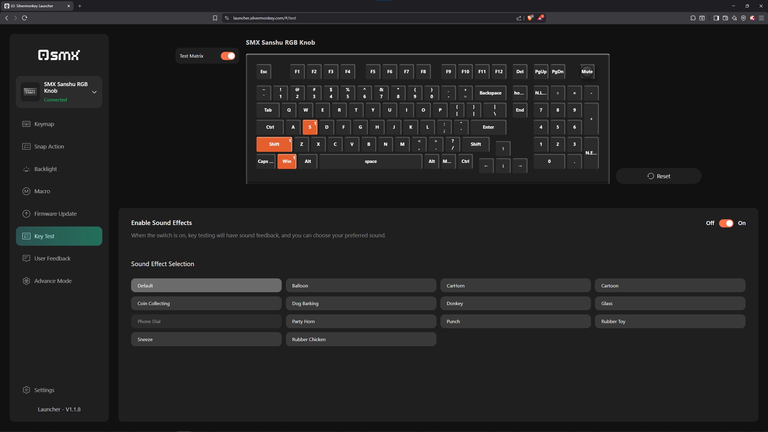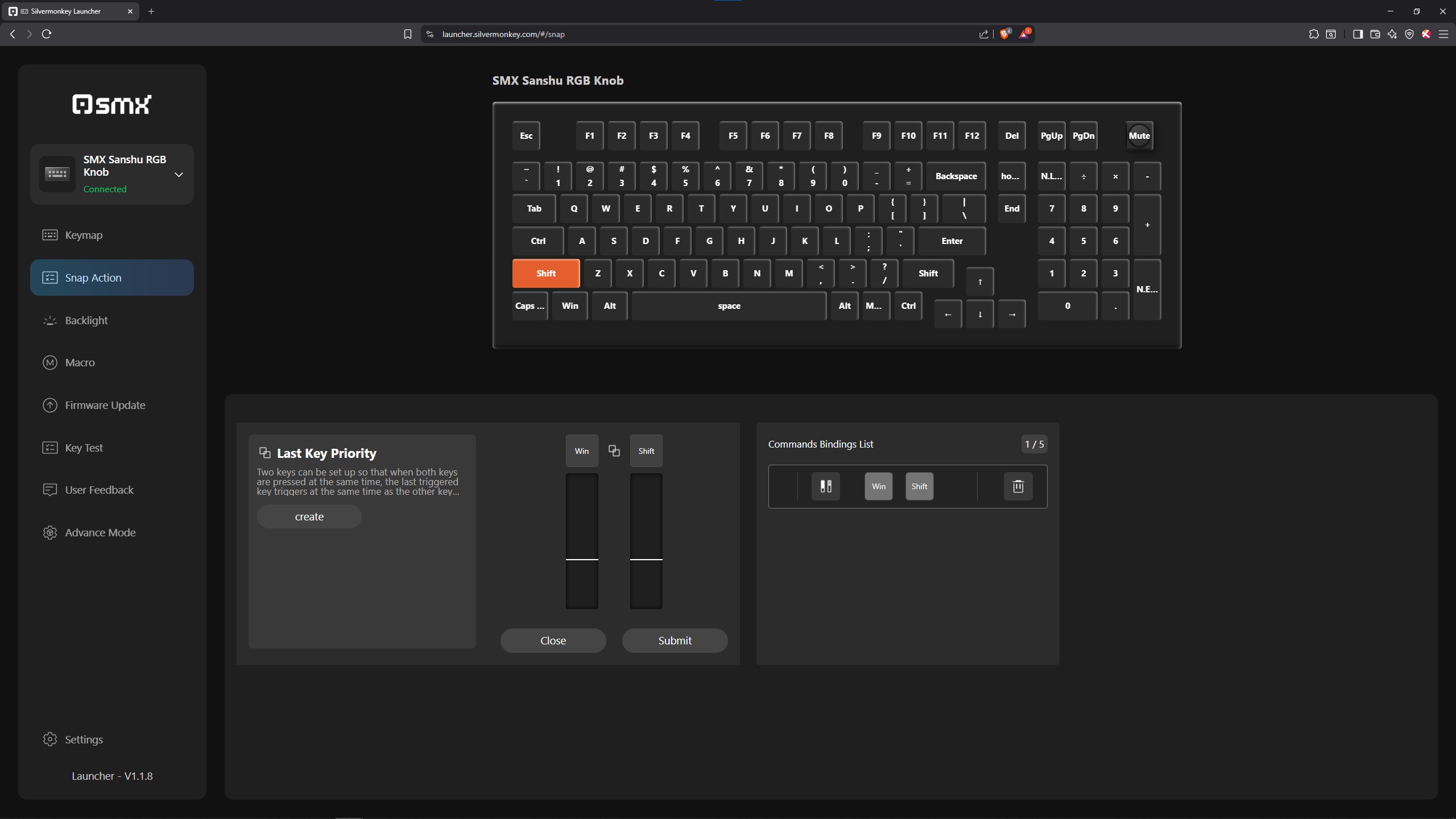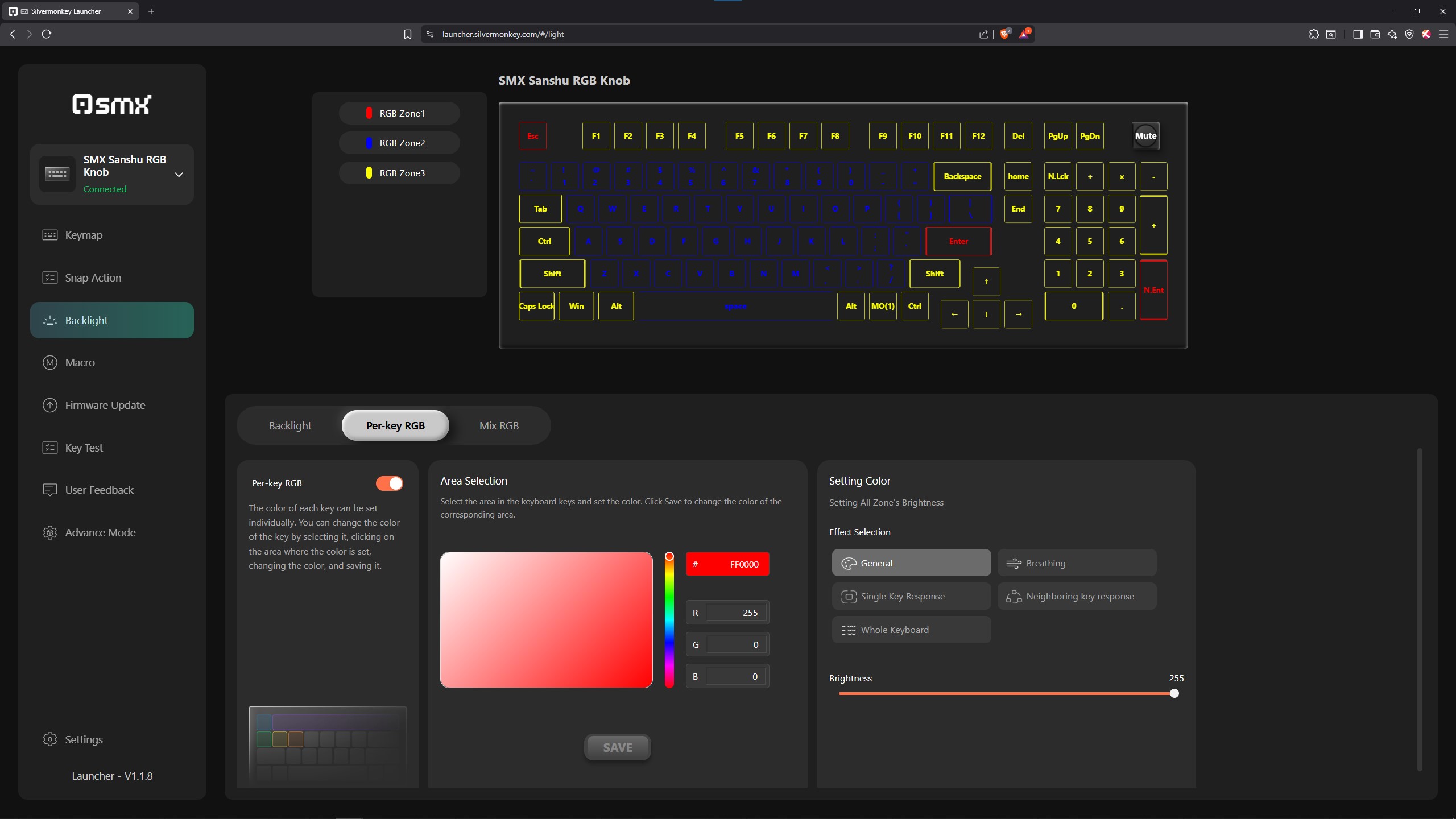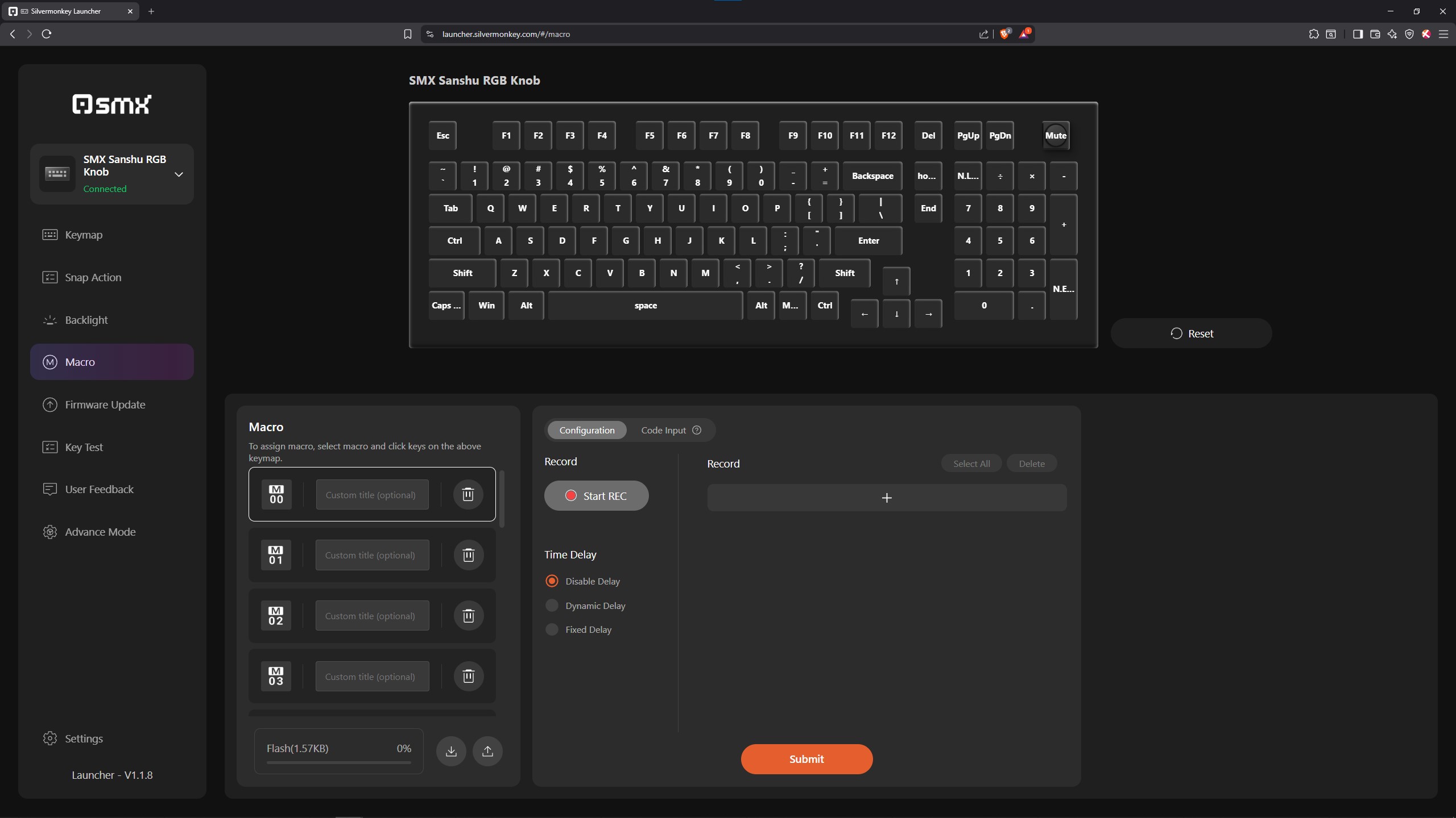 Wszystkie klawiatury magnetyczne, których w ostatnim czasie miałem okazję dotknąć, oferują software dostępny wyłącznie przez przeglądarkę. Staje się to swego rodzaju standardem, który powoli rozlewa się również na sprzęty oparte o zwykłe przełączniki MX style z metalowymi stykami w środku. Niektóre z nich mają też opcję pobrania aplikacji na komputer, ale zazwyczaj ciężko ją znaleźć. W przypadku testowanej dzisiaj SMX Sanshu jest podobnie, to znaczy osobiście nigdzie nie byłem w stanie odnaleźć pobieralnej apki i byłem skazany przez cały okres testów na tę dostępną na stronie producenta, operowanej stricte przez przeglądarkę. Męczy mnie to trochę, albowiem LibreWolf (czyli Firefox) nie wspiera takich softów i muszę specjalnie odpalać w tym celu Brave albo Edge. Na szczęście w tym przypadku wystarczy ustawić wszystko wedle własnego uznania, a konfiguracja zapisze się w pamięci wbudowanej klawiatury, dzięki czemu nie będziemy musieli już nigdy więcej zaglądać do oprogramowania. No chyba, że lubicie co jakiś czas coś zmieniać nawet w klawkach niemagnetycznych 😉