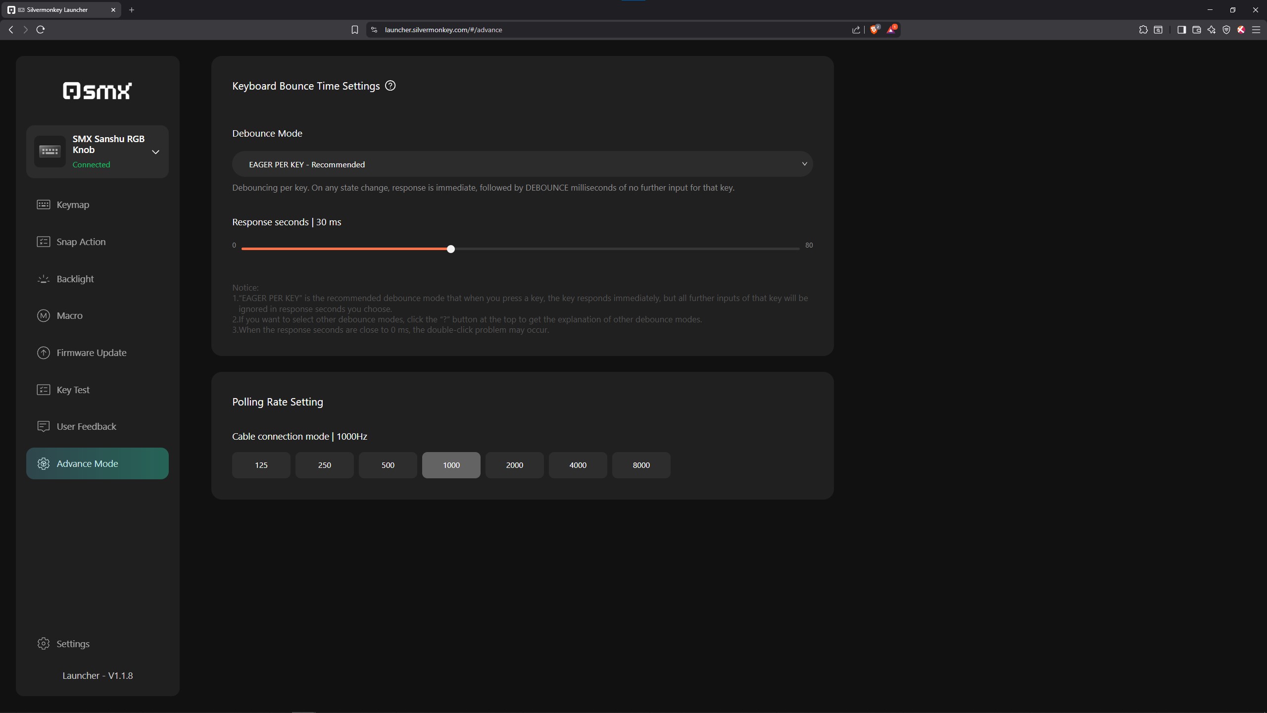 Wyważenie też swoje robi, bo zamontowane fabrycznie w Keychron Super Brown 15-milimetrowe sprężynki wymagają około 68 gramów siły do bottom-out’u, zaś przekroczenie bump-a to zaledwie 61 gf. Wykres wykonany przez ThereminGoat także świetnie pokazuje jak niewielką anomalią na tle liniowego skoku jest to sprzężenie zwrotne. Aktywacja standardowo odbywa się w okolicach 2 mm, zaś pełen skok ma klasyczne 4 milimetry długości. Powoduje to, że w teorii są to przełączniki do wszystkiego, a więc i grać i pisać powinno dać się na nich komfortowo. Wiadomo, że wszystko zależy od preferencji, natomiast w moim przypadku byłem w stanie osiągać dosyć sensowne prędkości WPM jak na siebie na SMX Sanshu, a do tego grało mi się na niej w osu! i CS2 równie dobrze co na konkurencyjnych produktach. Coś jednak stanęło mi na przeszkodzie i przez długi czas nie wiedziałem czym jest to spowodowane.. Otóż producent pozwala nam na ustawienie wyższego niż 1000 Hz odświeżania oraz zabawę opóźnieniami, z poziomu oprogramowania. Pierwotnie ustawiłem rzecz jasna najlepsze wartości, to znaczy 8000 Hz i 1 ms, ale prędko okazało się, że klawiatura bardzo często chatteruje, czyli wprowadza kilka razy ten sam znak, choć klawisz fizycznie wcisnąłem tylko raz. Obniżyłem więc te ustawienia do domyślnych i… problem pozostał. Po paru dniach kombinowania i walki z konfiguratorem doszedłem do wniosku, że jeżeli nie jest tutaj winny software ani firmware, a także sama klawiatura jest w pełni sprawna, to winowajcą muszą być moje palce, nieprzyzwyczajone do tak małego bump-a. Widzicie, wciskając te przełączniki jak liniowce można czasem przypadkowo i na ułamek sekundy cofnąć i docisnąć klawisz właśnie na wysokości sprzężenia zwrotnego, przez co ten aktywuje się kilkukrotnie. Najwidoczniej to tego właśnie doświadczałem na przestrzeni tygodni testów. Dodam, że nie miałem czegoś takiego na żadnej innej klawiaturze, więc jestem ciekaw czy ktoś z Was też ma SMX Sanshu i też zauważył podobny problem. Podzielcie się doświadczeniami w komentarzach!