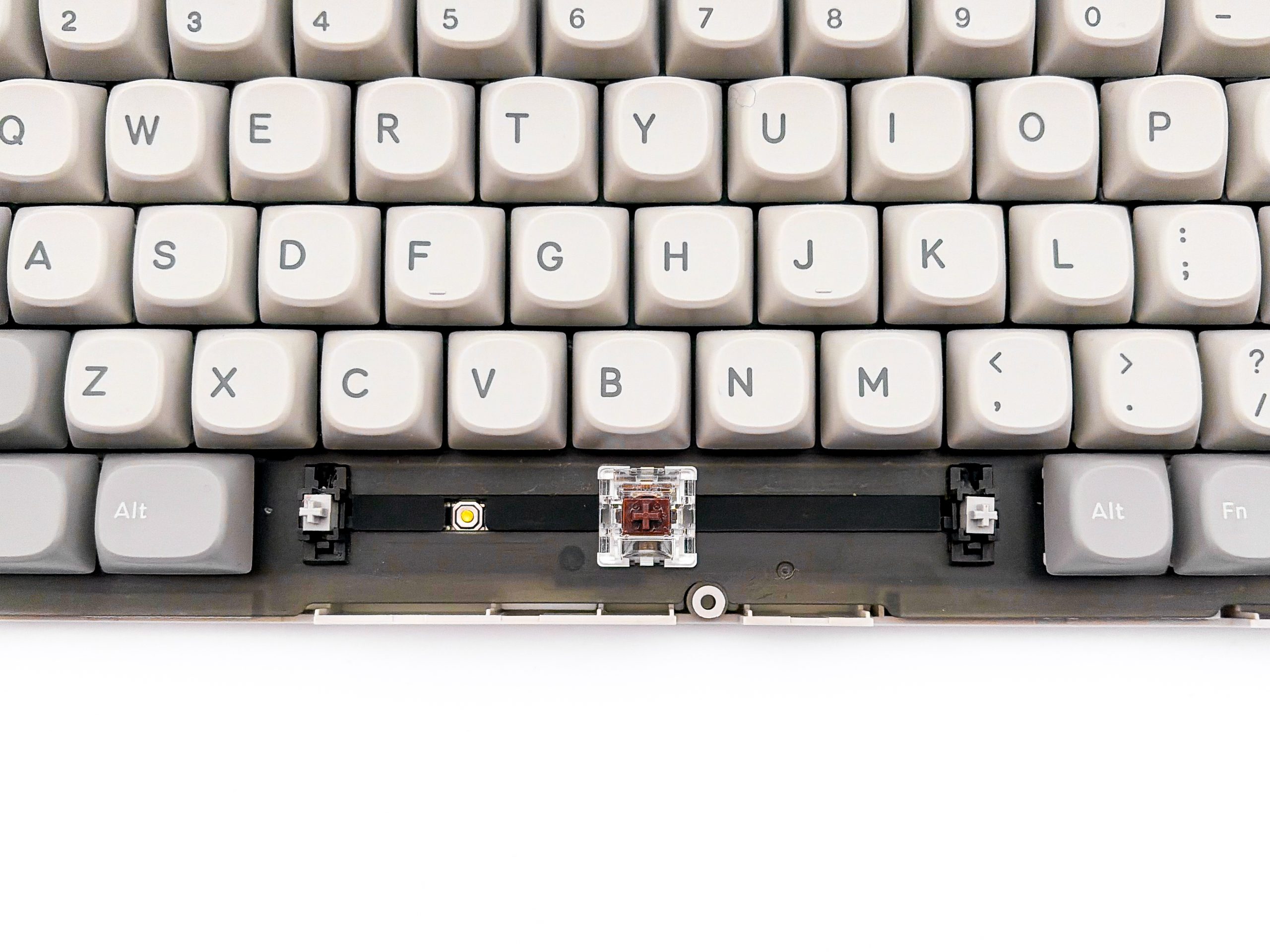 W końcu! Byłem już naprawdę zmęczony, bo ostatnimi czasy nie mogłem trafić na sprzęt do testów, w którym stabilizatory byłyby perfekcyjne. SMX Sanshu ratuje jednak dobre imię budżetowych produktów i oferuje nam świetne staby, z których nie wydobywa się prawie żaden niepożądany odgłos. Producent zadbał bowiem o przymocowane na klipsy do płytki montażowej, znajdujące się pod każdym dłuższym niż 2u klawiszem, stabilizatory, poprzez naniesienie na ich druciki grubego smarowidła. Jest go tam sporo i to dobrze rozprowadzonego, dzięki czemu druciki nie wydają żadnych klekoczących odgłosów. Robótka wygląda w dodatku na tyle dobrze, że nie spodziewałbym się konieczności poprawiania smarowania we własnym zakresie przez długi okres od zakupu. Cieszy mnie niezmiernie, że tak dopracowane stabilizatory stają się obecnie standardem i kupując dowolną klawiaturę prawie w ogóle nie musimy martwić się, że dostaniemy suche lub źle przesmarowane staby. Choć ostatnimi czasy natrafiłem na kilka modeli z delikatnie niedoskonałym brzmieniem wynikającym z krzywych bądź błędnie smarowanych drutów, to ogólnikowo rynek ma się naprawdę dobrze i są to wciąż wyjątki.